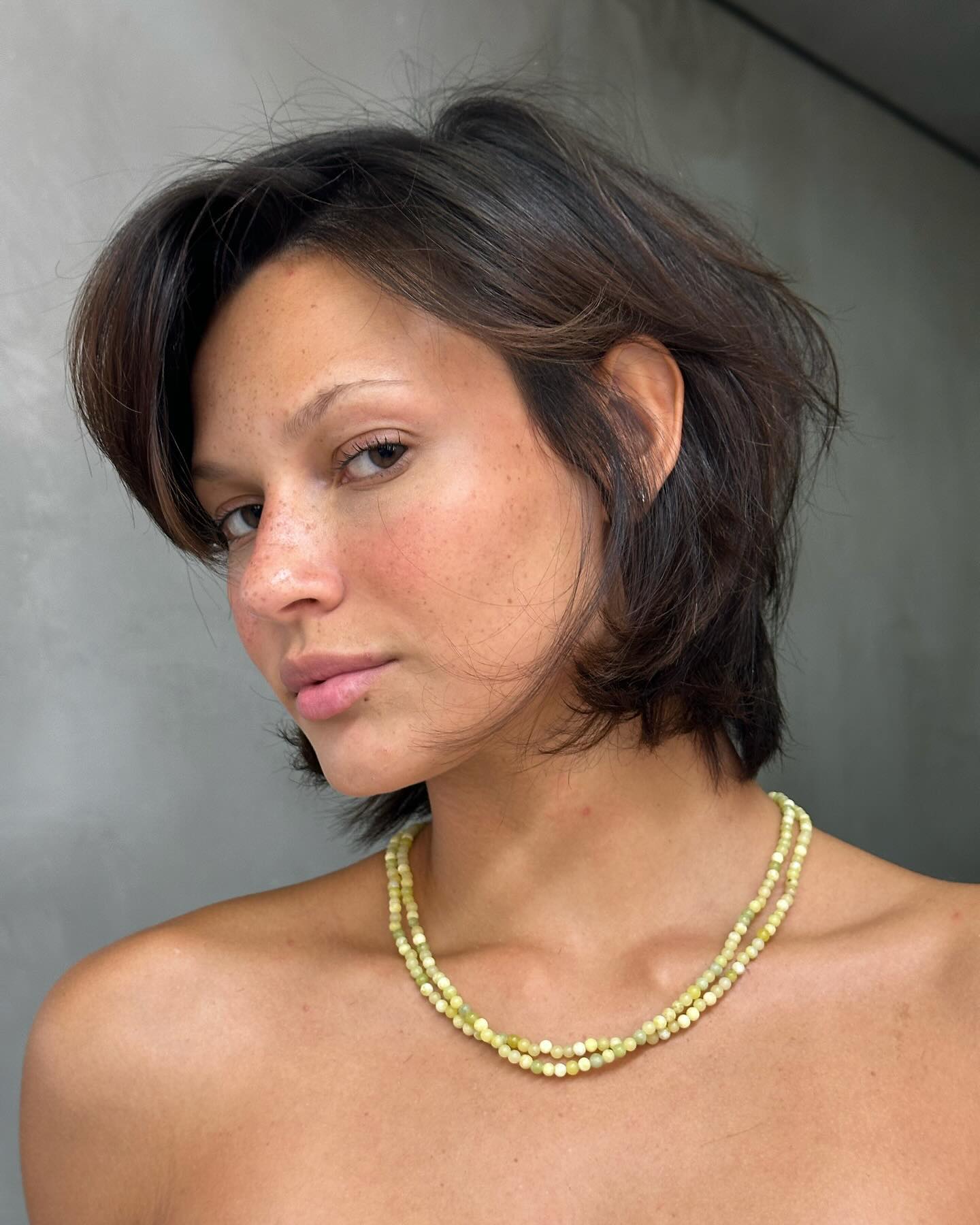 This medium-length butterfly cut combines gentle waves with curtain bangs, adding a touch of volume and sophistication. The rich brown hue complements the short hair shoulder length look, creating a flattering frame for the face. It’s a versatile style that works well for both casual and refined looks.