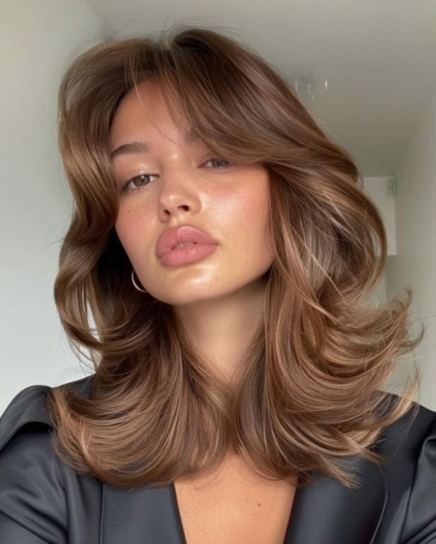 This butterfly haircut features soft caramel-toned layers and face-framing curtain bangs that add volume around the cheeks. The long layers provide a natural lift, creating a bouncy and sophisticated look. It’s perfect for those seeking an effortlessly stylish, full-bodied hairstyle.