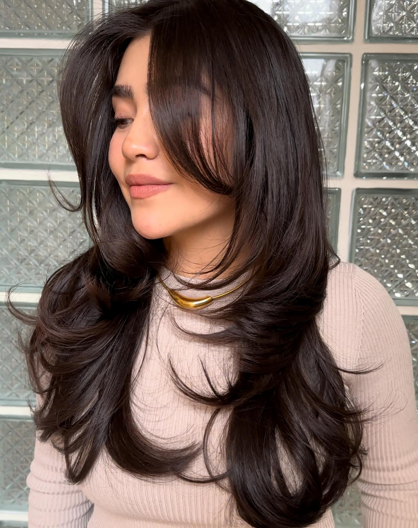 This butterfly haircut features long, voluminous layers that frame the face and add movement. The rich brunette tones enhance the depth and pair well with long layers straight hair and curtain bangs. It’s an ideal style for long hair that flatters a round face, offering a soft yet defined look.