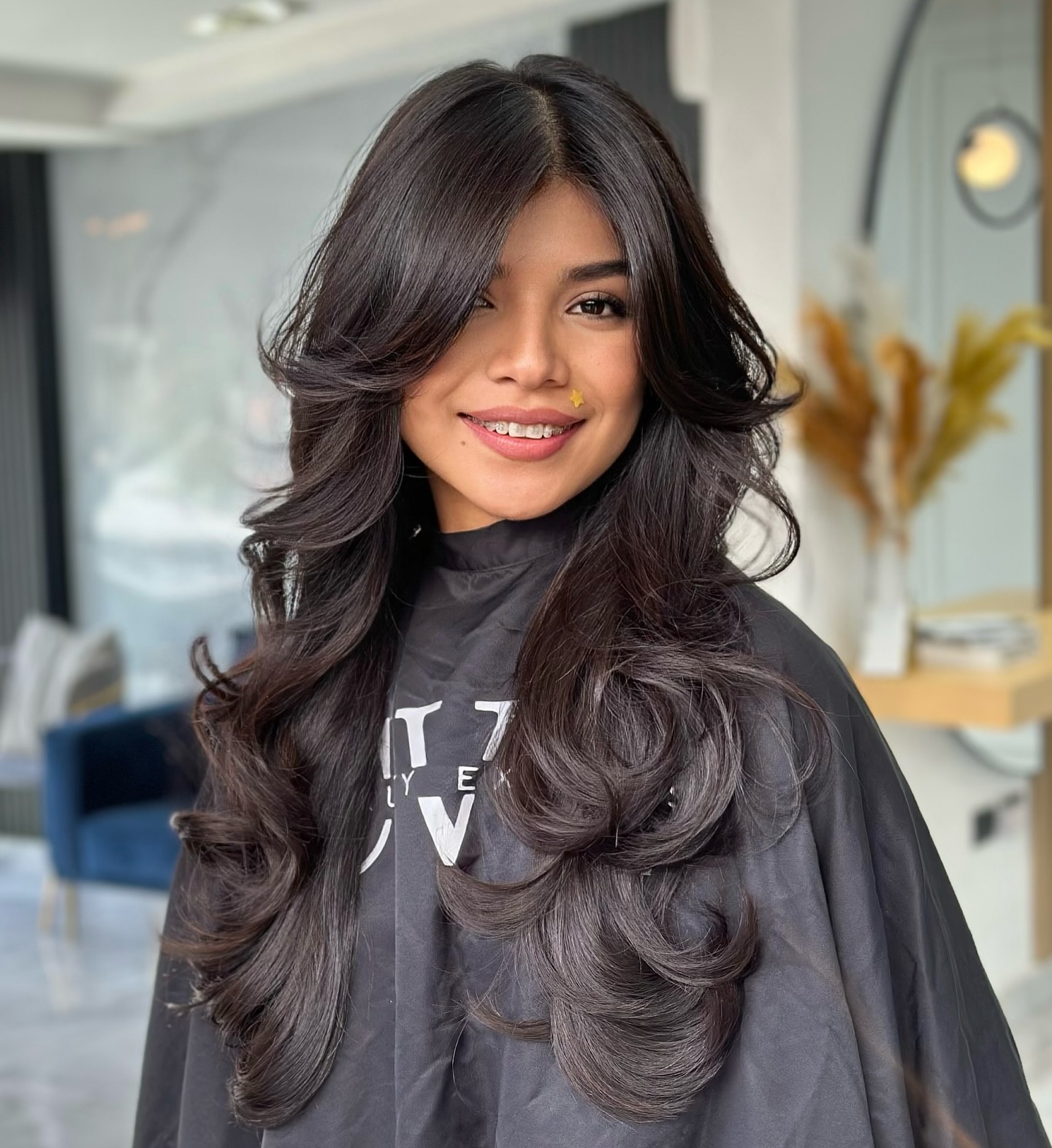 This long butterfly haircut showcases rich espresso layers that add depth and volume, flowing down gracefully. The long hair straight with curtain bangs look is enhanced with feathered ends, ideal for curly/wavy hair types seeking a bit of extra texture. It’s a bold yet elegant style that highlights the natural beauty of long, thick hair.