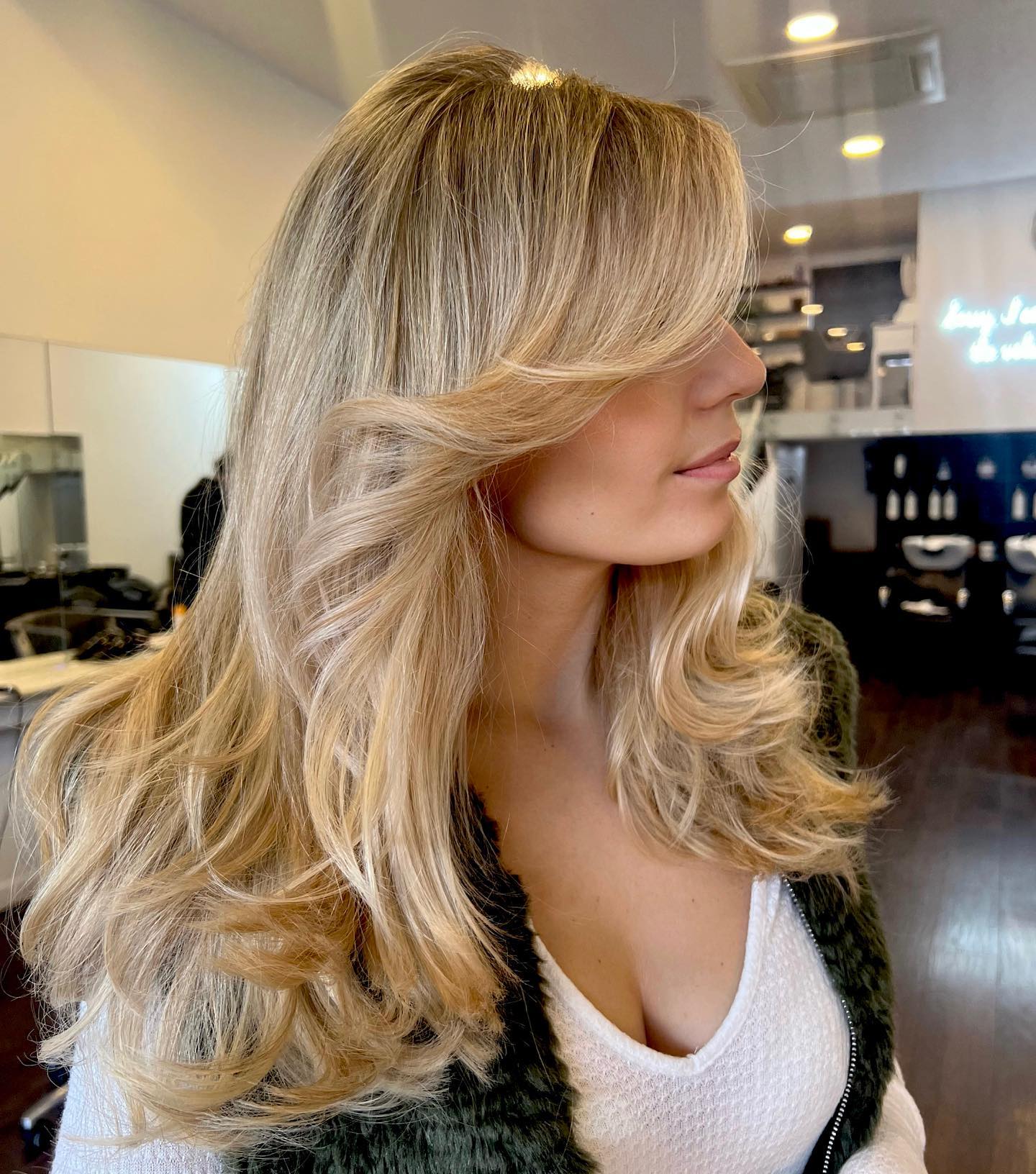 #15 Honey Blonde Layers with Bold Curtain Bangs