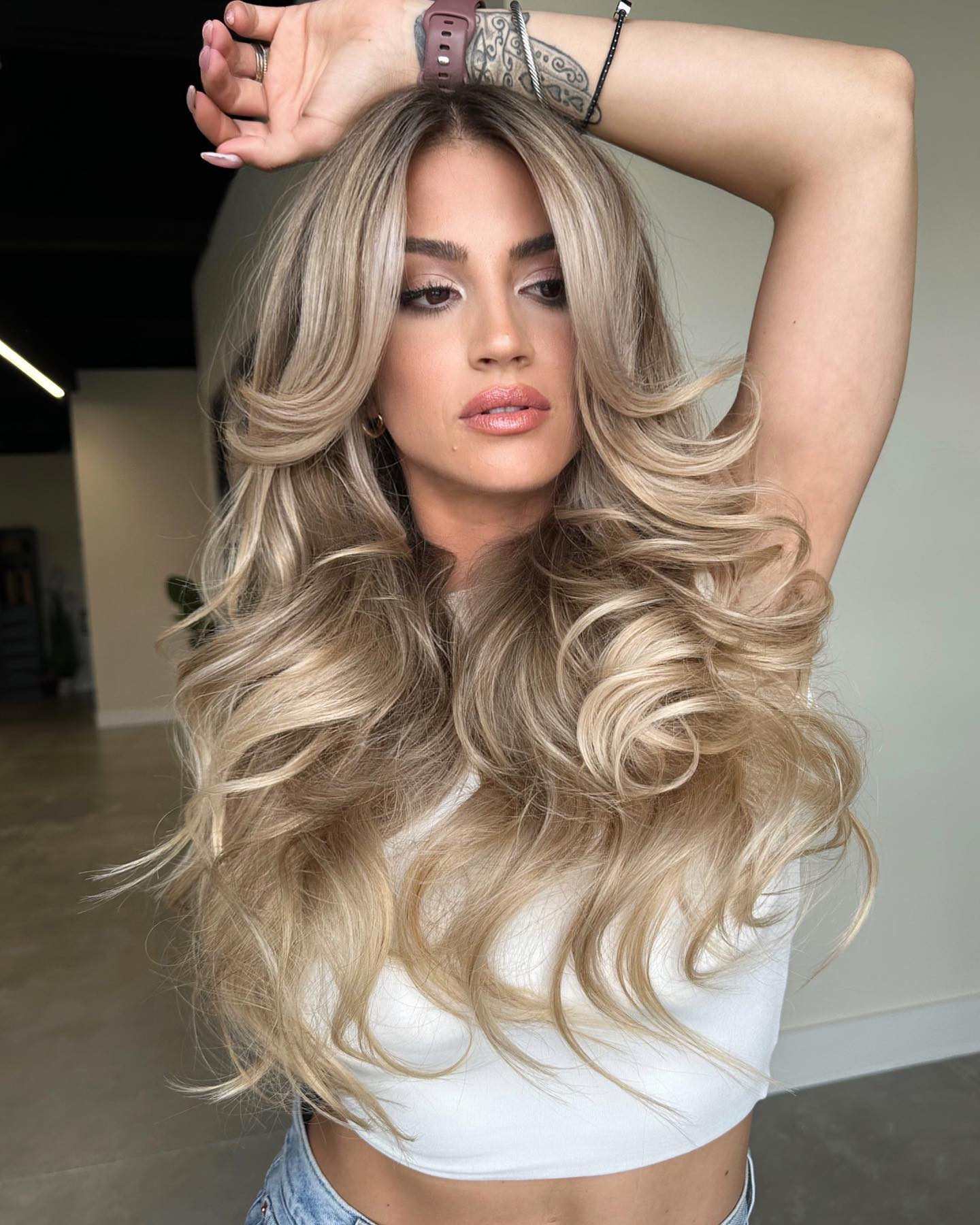 This ash blonde butterfly haircut features voluminous layers that add dimension and movement. The long layers curtain bangs curly style frames the face while enhancing the natural texture. This look is ideal for those who want a glamorous, bouncy finish with feathered ends.
