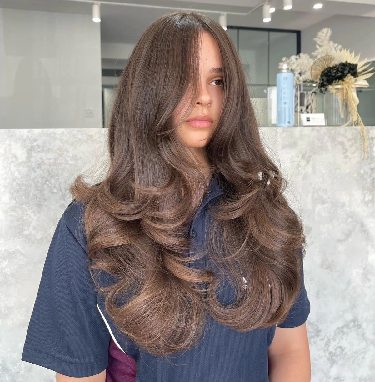 This butterfly haircut features deep chocolate layers with soft, voluminous curtain bangs framing the face. The long layers cascade with a beautiful flow, adding dimension and movement. This look is ideal for those seeking a rich, polished style with a natural finish.