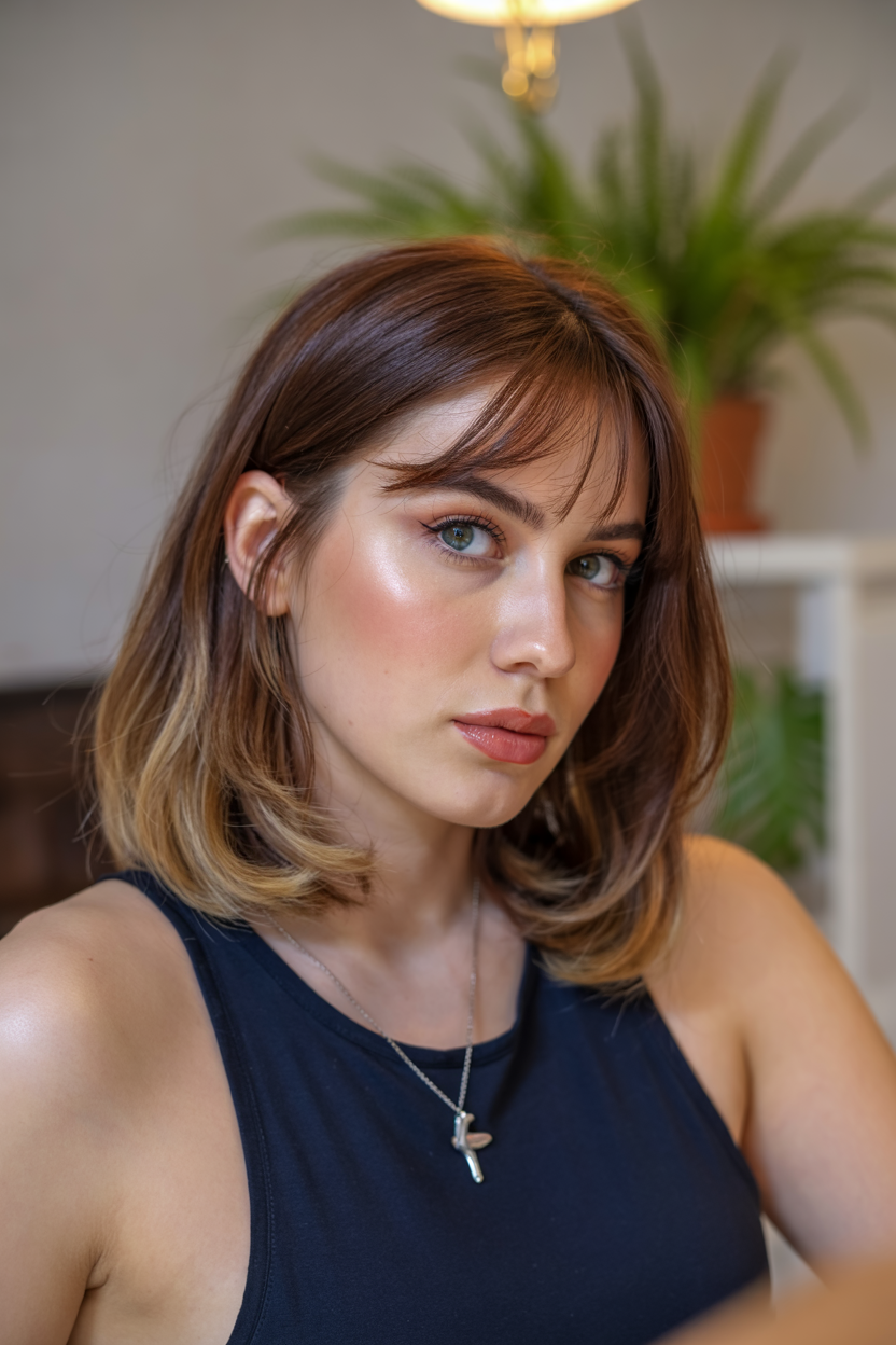 A short blunt cut bob haircut features soft light and dark transitions from the roots to the ends. The hairstyle features selective outward flicks to add attitude while maintaining structure and creating a disheveled yet well-defined look. Great for 2025, the style provides appropriate volume for fine hair types. The simple, bold choice is for those looking for an everyday chic look.