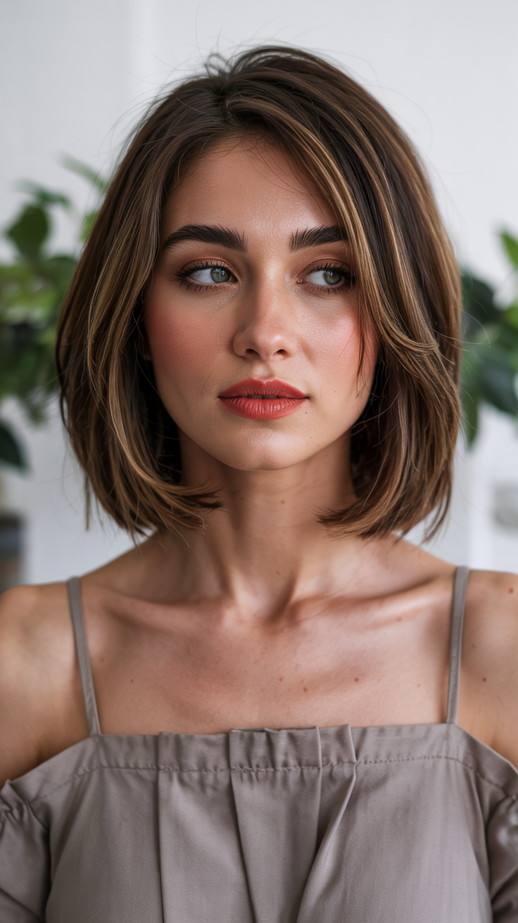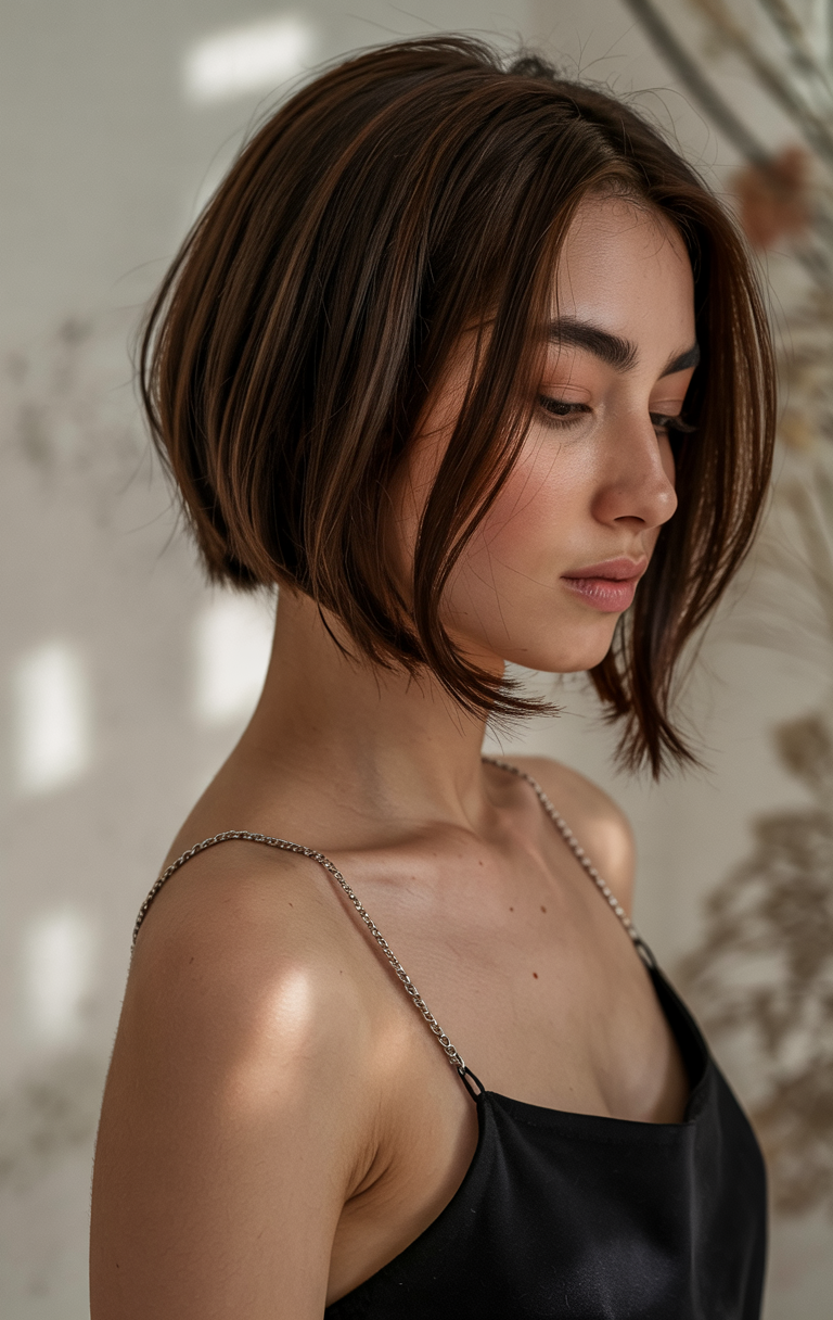 A sleek bob style gathers Italian sophistication with textured edges and a pulled back section that extends away from the face. Warm brown tones add depth to the hair, along with a well-defined tailpiece that shapes the hair just above the shoulders. This stylish cut offers a sophisticated elegance that adds confidence to any outfit. This hairstyle provides women in the year 2025 with sophisticated and elegant ideas for their short haircuts.