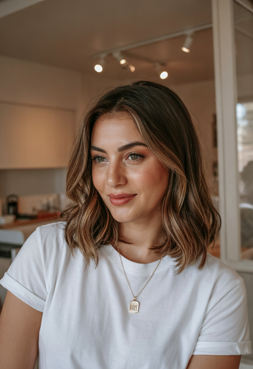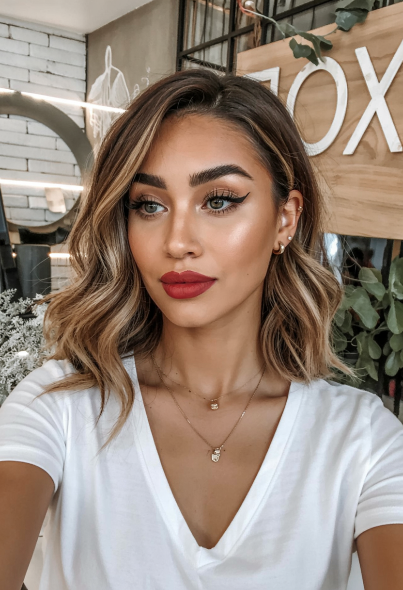 A shoulder-length wavy bob with fullness at the back and soft movement at the ends. The golden balayage highlights create a spectacular contrast as they work well with the dark base color to add visual depth to the style. Women who prefer an elegant yet practical short hairstyle inspiration will find this style appealing. This stylish cut effortlessly transitions from day to night with its chic appeal.
