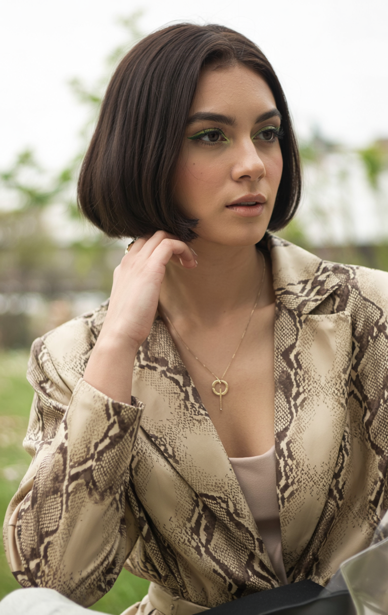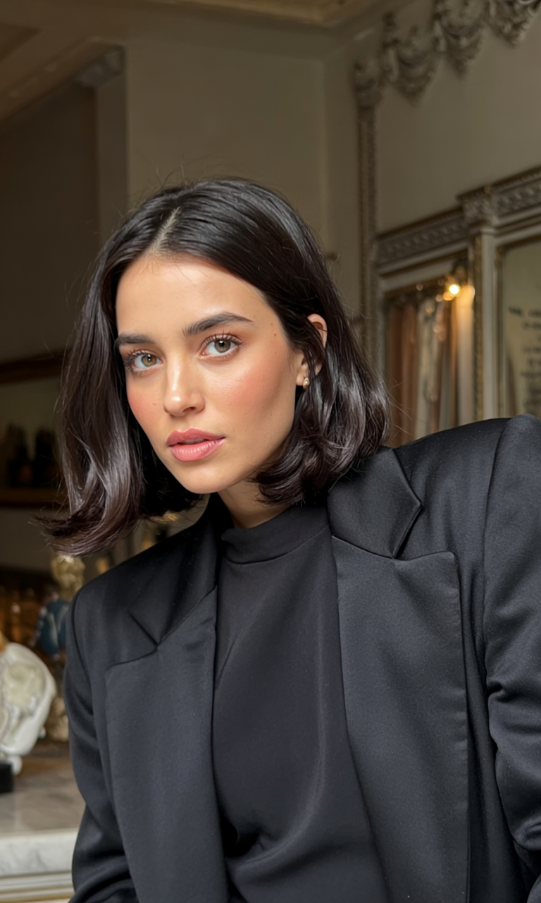 The medium-length bob design incorporates natural brown elements that receive a delicate layering process to smooth the outline of the hair. The soft angled cut creates texture and the deep side part instantly creates natural volume at the crown. Ideal for transitional weather and effortlessly chic styling. A confident everyday look with a touch of Italian street style cool.