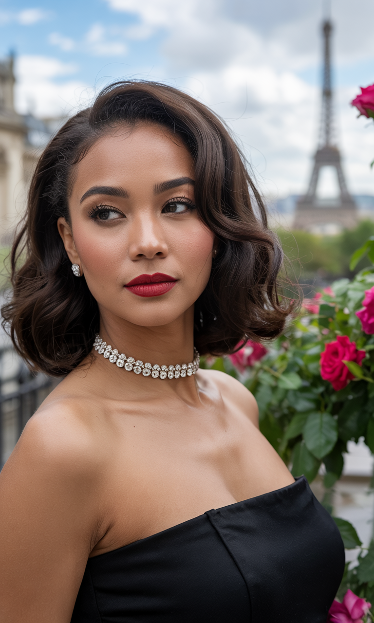 This classic bob is cut above the shoulders before being swept into deep waves for a vintage Parisian look. This stylish bob is perfect for sophisticated events and adds sophistication to everyday wear with its textured look. The hairstyle retains its French elegance with a sleek finish that remains classic but is perfectly suited to the fashions of 2025. The deep side part enhances both the volume and the sculpted look of the wavy cut.