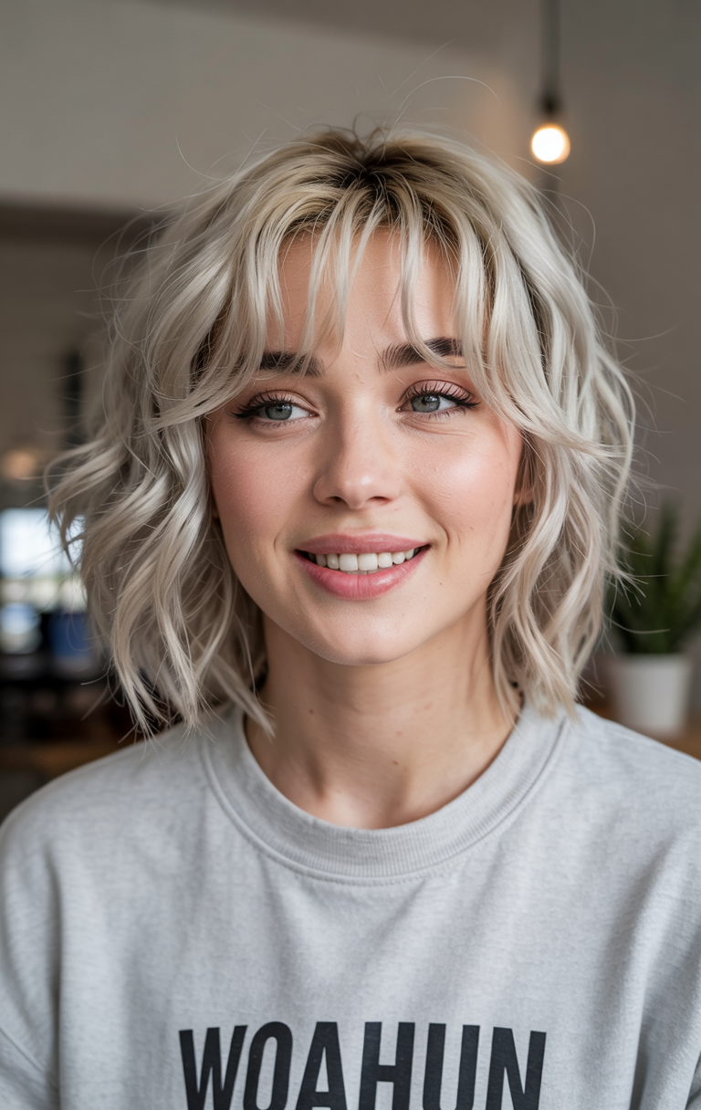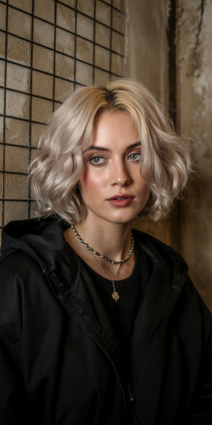 The voluminous wavy bob features icy blonde tones and light shadow roots that naturally blend with the growing sections. This style features soft, chunky waves that create a defined shape before being finished in a relaxed manner. This style is perfect for people who want a bold, fashionable look that requires little maintenance. This hairstyle is suitable for everyday wear as well as fashionable outfits with texture.