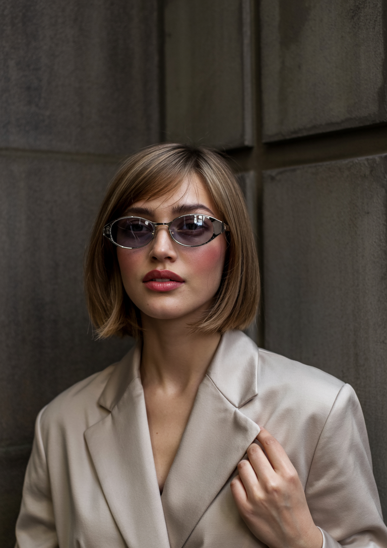 This short bob features cool platinum tones and light micro fringes that cross over the eye area. The layers of the cut pay attention to maintaining lightness and movement throughout the ends. The sleek silhouette delivers retro-trendy fashion combined with contemporary sophistication. A perfect example of playfully chic styling for the woman of 2025.
