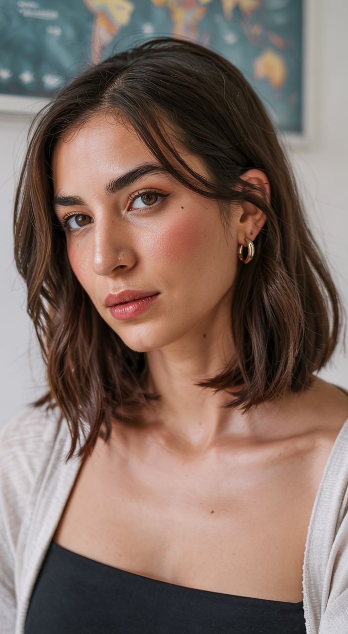 A tousled bob with sun-kissed waves has a light, tousled texture that complements the long bangs that fall softly in the middle. The chocolate brown hue maintains an organic look, and the overall shape is a contemporary inversion of the shaggy style. The hairstyle provides the perfect holiday style and carefree summer aesthetic for 2025. The style adds significant volume to lighten fine hair textures.