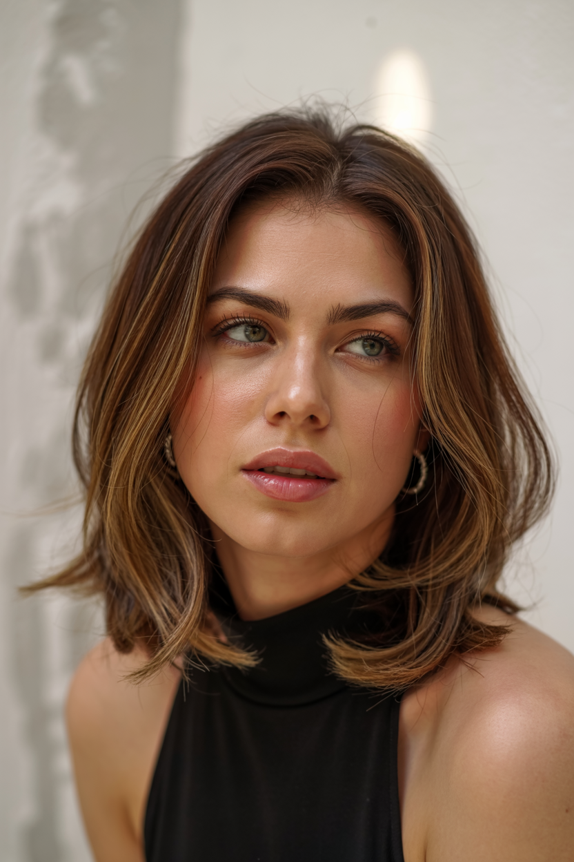 This perfectly shaped, medium-length bob offers both elegant structure and soft shapes. The brunette highlights blend the original hair color with decorative caramel highlights that enhance the look of the cut. A subtle layered edge from the jawline characterizes this look, creating a flawlessly polished finish. This adaptable style works well with simple and fashionable clothing options.