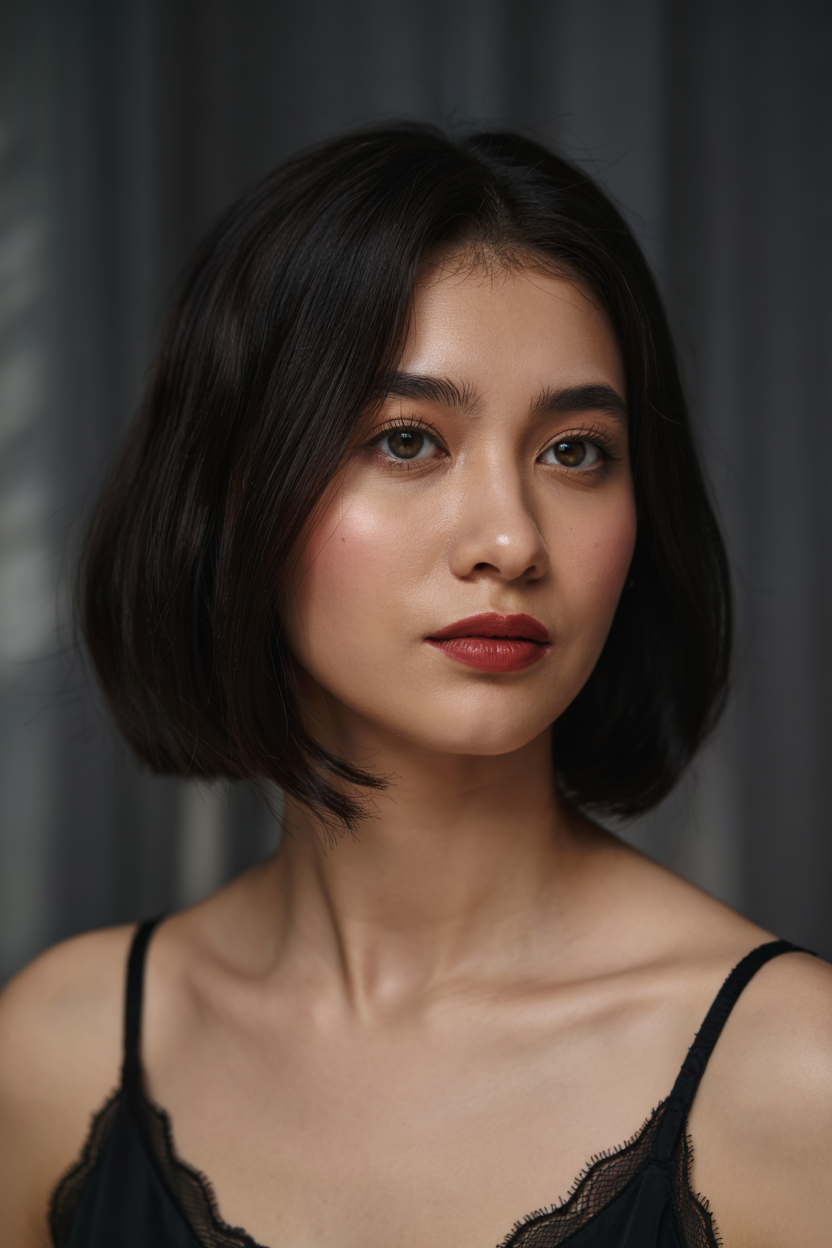 A sleek and elegant bob shape emerges from this sleek short bob as the glossy black strands fold inward to create an attractive finish. The center part creates balance and the finish gets its minimal Japanese style refinement. This hairstyle offers a modern look that maintains its elegance as you transition from day to night without the need for constant maintenance. It is an enduring style that is right in line with 2025 fashion standards.