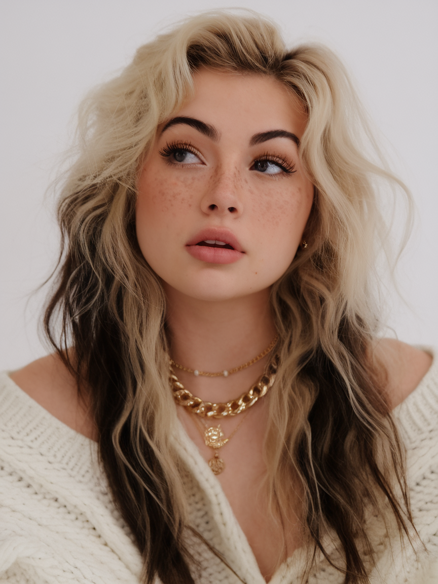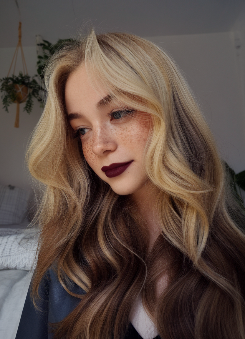 This hairstyle features a bold two-toned shag, blending light blonde and dark brown for contrast. The natural waves and choppy layers add texture and volume, making it ideal for fine hair. It’s a trendy and effortless spring haircut with a touch of edge.