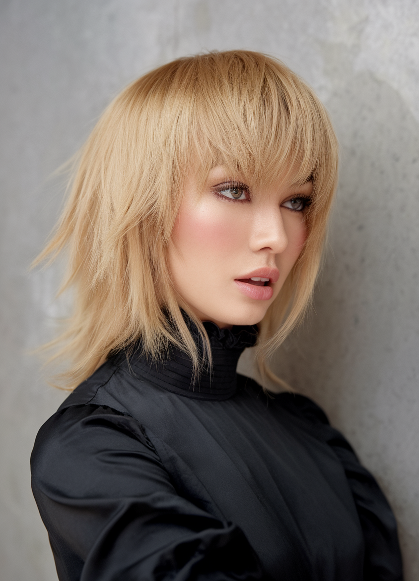 This mid-length shag is styled with textured, choppy layers and feathered bangs for a modern, edgy look. The soft layers frame the face beautifully while keeping the overall style lightweight and easy to manage. It’s a trendy spring haircut perfect for those with fine hair seeking added movement and texture.