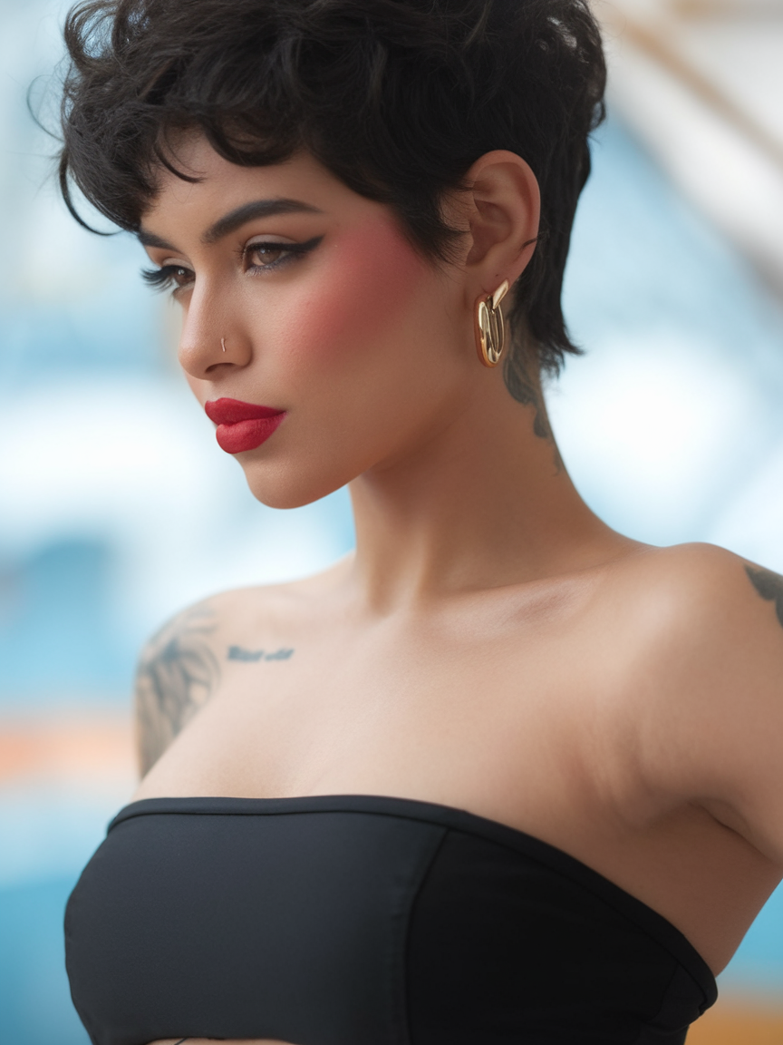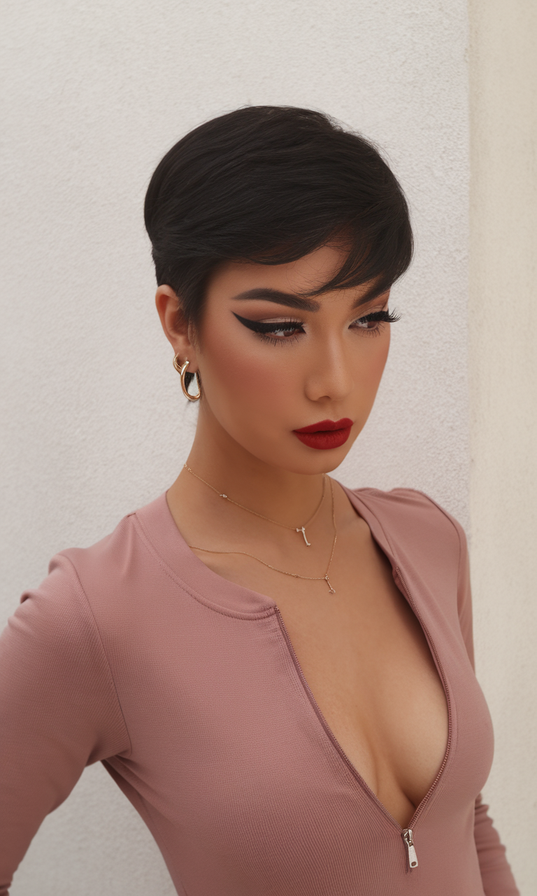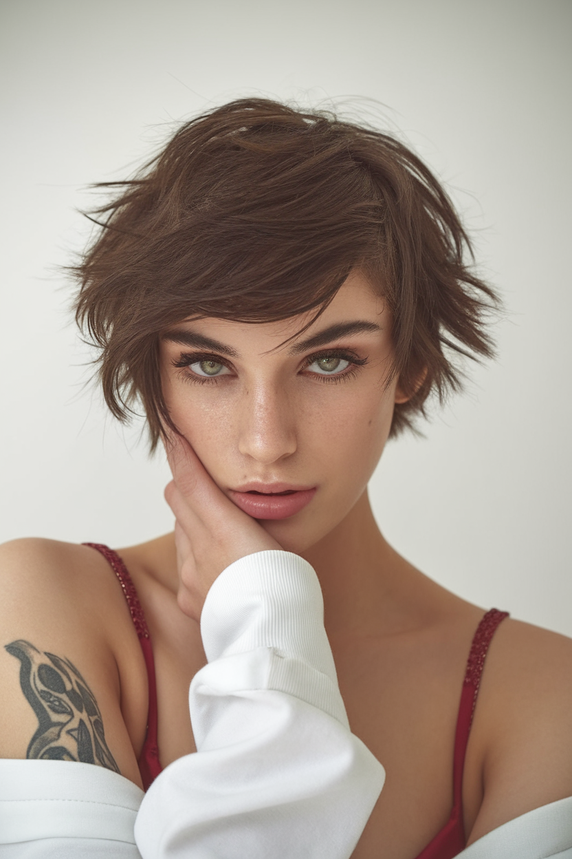 This short pixie cut is styled with choppy layers to give thin hair a fuller appearance. Side-swept bangs soften the look and flatter round face shapes. It’s a low-maintenance, bold haircut ideal for spring 2025.