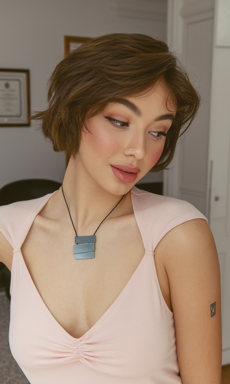 This short bob is styled with soft, feathered layers that add dimension and movement to fine hair. The tousled texture enhances volume, making it a flattering option for spring. It’s a versatile, low-maintenance haircut that perfectly frames the face.