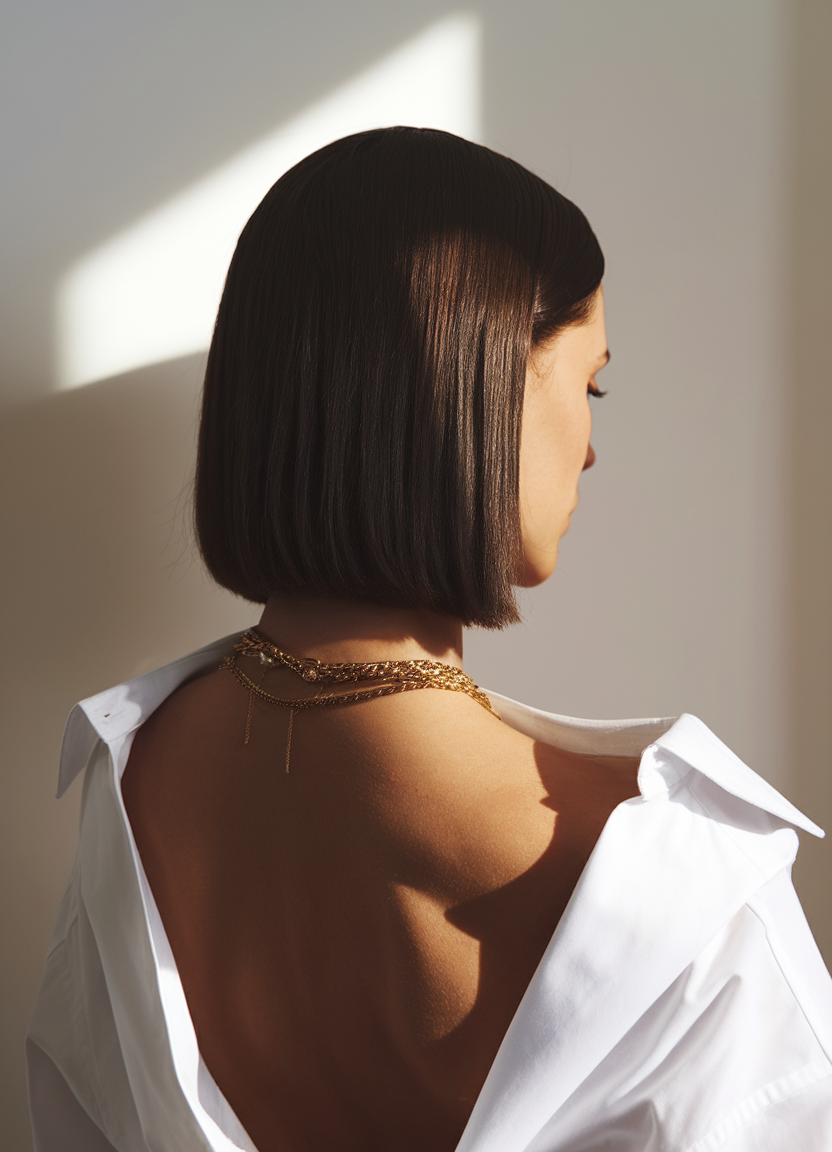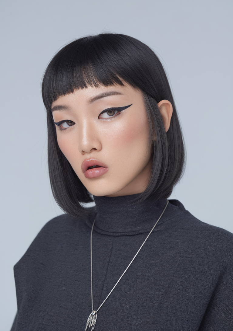 This sleek blunt bob is cut to a sharp, even length for a clean and polished appearance. The smooth styling enhances the shine and thickness of fine hair, creating a sophisticated look. It’s a timeless choice for those seeking a minimalist yet elegant hairstyle.