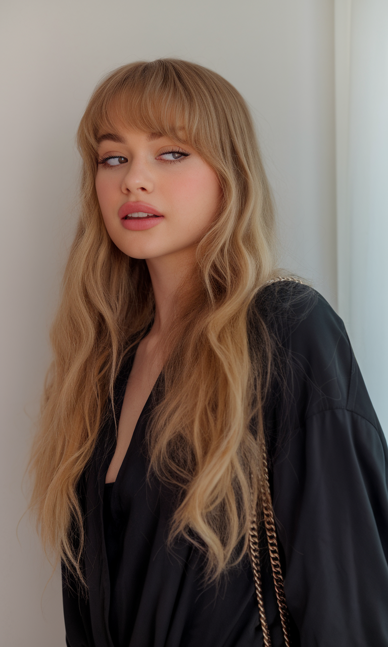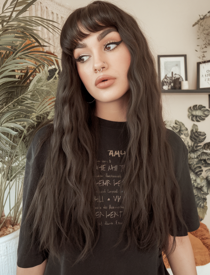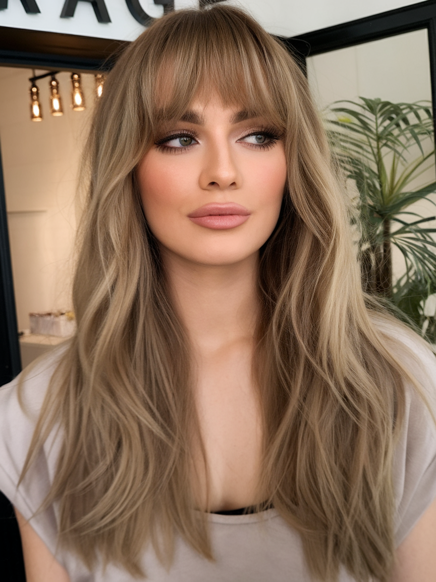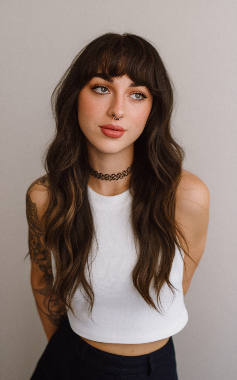 This long haircut features cascading wavy layers and soft bangs that frame the face delicately. The texture enhances volume while keeping the style lightweight and effortless. It’s a flattering option for fine hair looking for movement and flow.