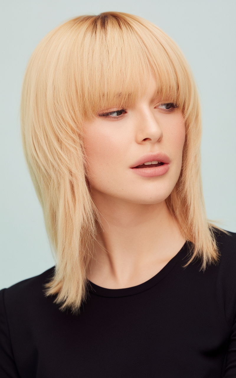 This hairstyle combines long, flowing locks with edgy micro bangs for a unique contrast. The blunt fringe adds a bold, contemporary touch, while the length keeps the style versatile. It’s perfect for fine hair, adding character without compromising volume.