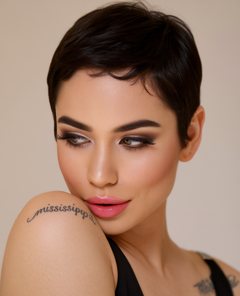 This pixie cut is styled with soft layers for added texture and volume, perfect for fine hair. The close-cropped length frames the face beautifully and gives a sleek, sophisticated look. It’s a low-maintenance yet modern haircut ideal for spring.