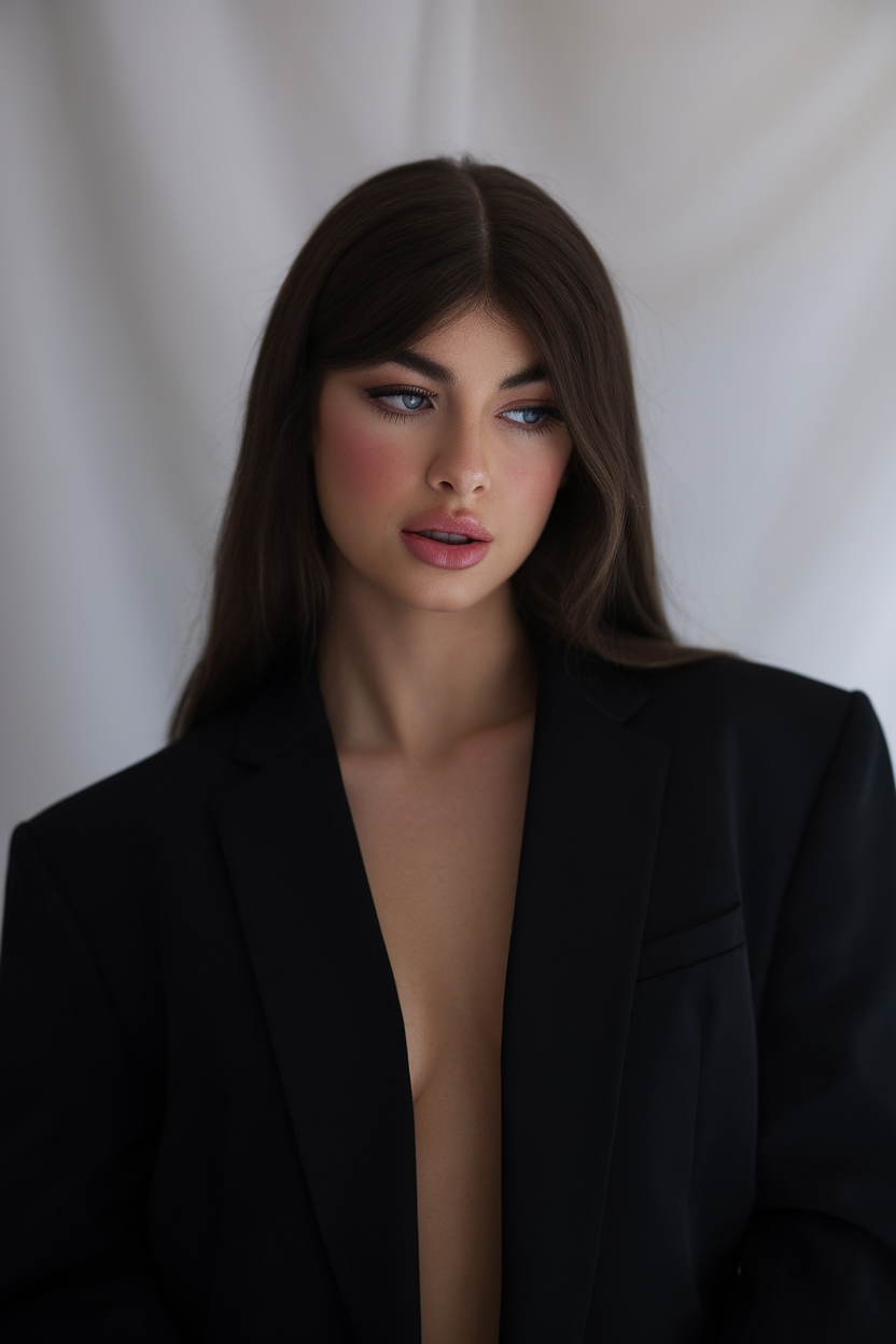 This hairstyle features long, straight locks with a polished finish and a center part for symmetry. The smooth texture enhances shine and volume, making it a great option for fine hair. It’s a timeless, elegant choice for those who prefer simplicity with impact.