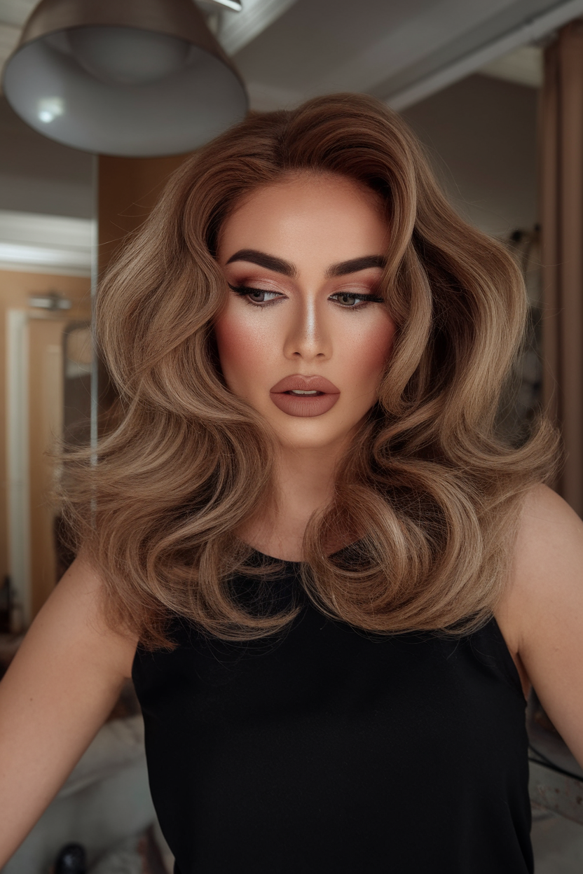 This hairstyle boasts dramatic, voluminous waves paired with a classic center part for balance. The full-bodied curls add texture and glamour to fine hair while keeping it bouncy. It’s a perfect spring style for those wanting to make a bold statement.