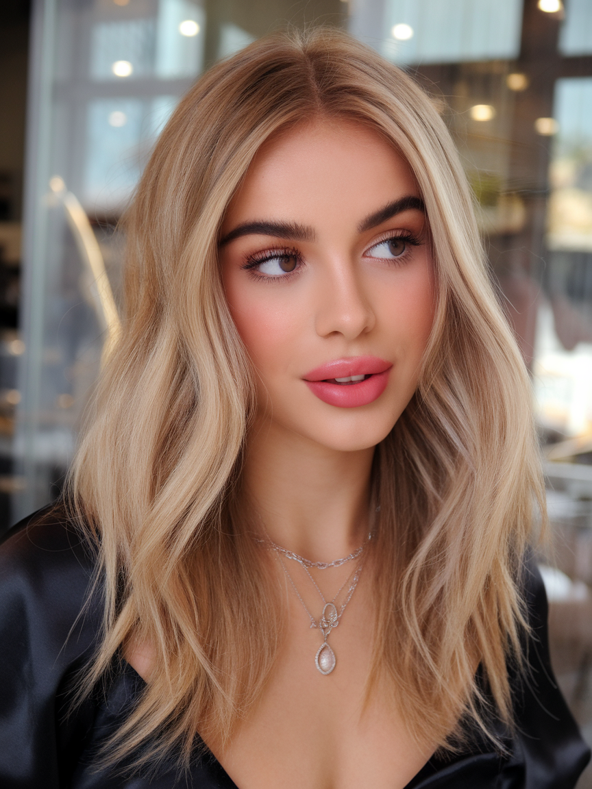 This long-layered wavy style features butterfly layers that add volume and bounce. The golden blonde tones create depth, while the face-framing strands highlight the cheekbones beautifully. This trendy and elegant cut is perfect for those who love classic yet modern color ideas in 2025.
