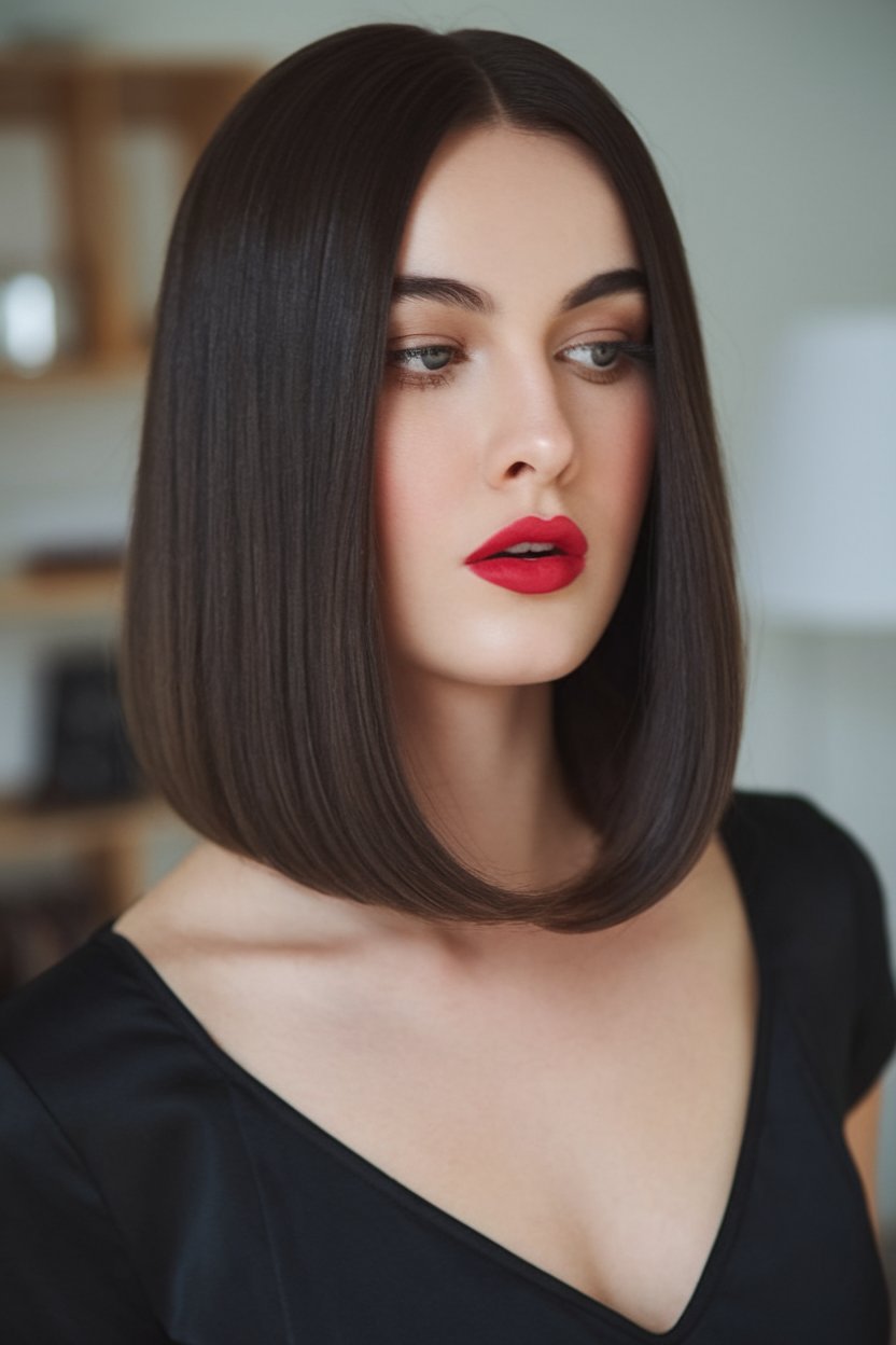 This straight, shoulder-length bob features a sleek and polished finish with a deep black shine. The blunt cut enhances the boldness of the look, making it a chic and modern choice. A trendy and sophisticated option for those who love a sharp, structured haircut in 2025.