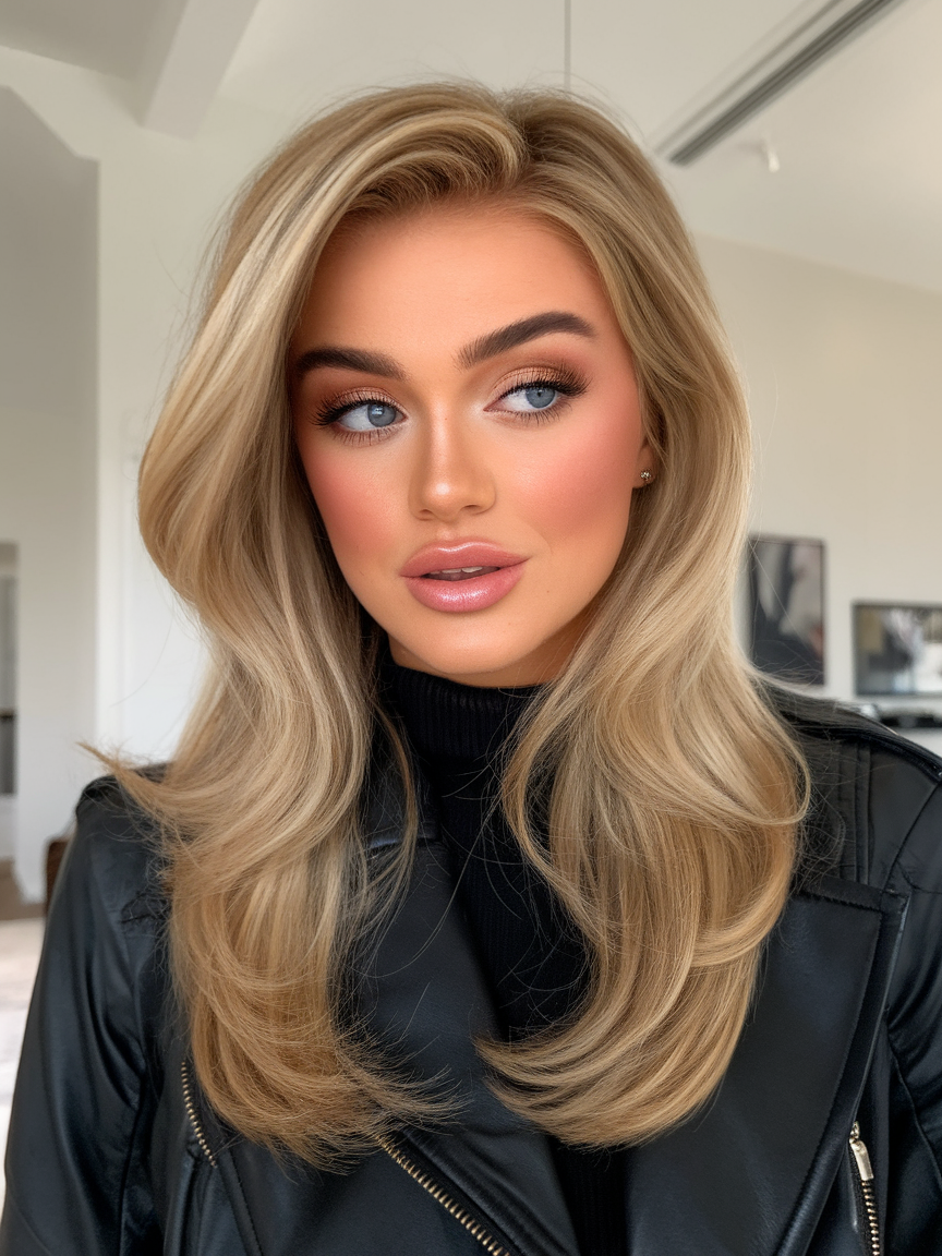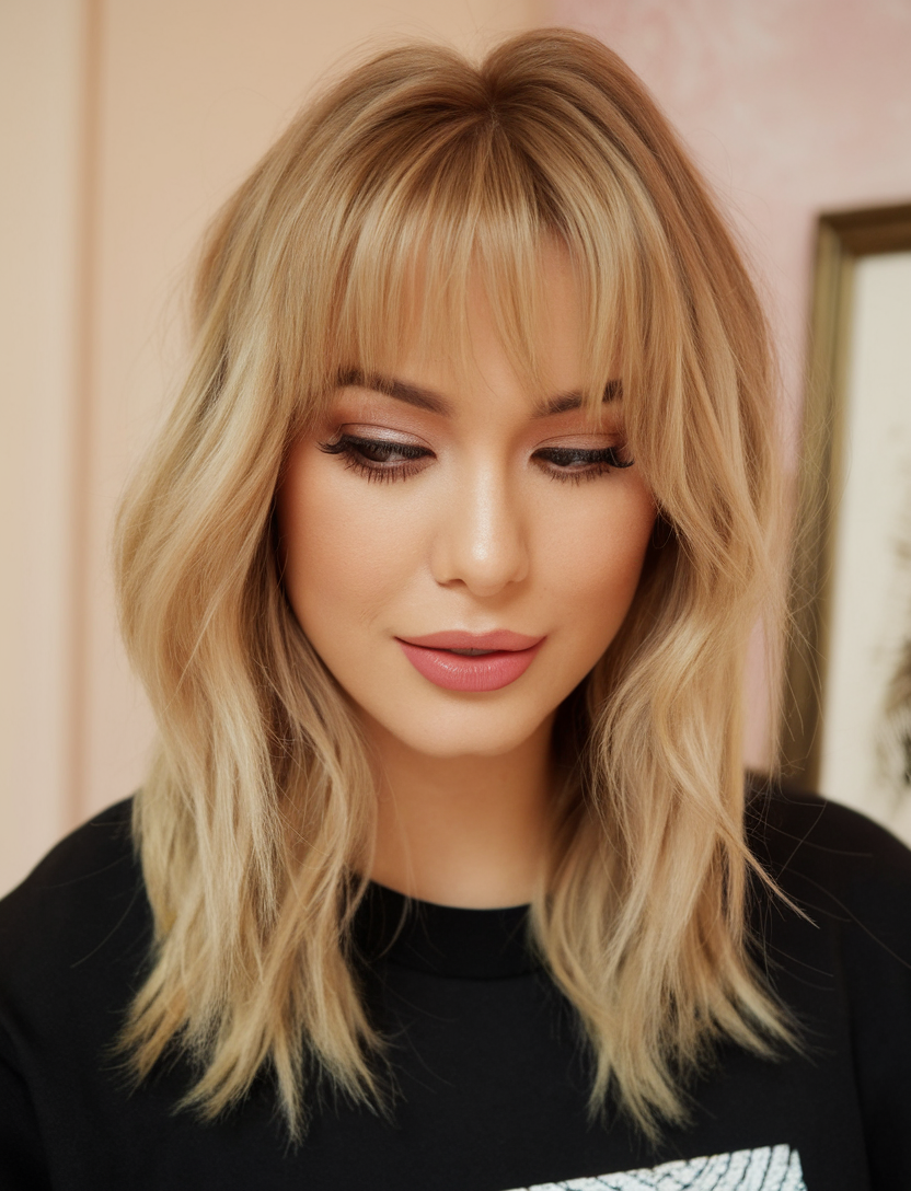 This layered medium-length haircut showcases soft feathered layers for a voluminous and dynamic look. The warm blonde tones add depth, while the side-swept layers enhance movement. A trendy and elegant style for those looking for a chic and timeless haircut in 2025.