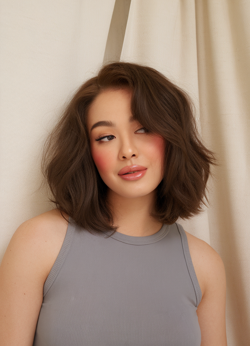 This medium-length wavy bob features choppy layers for a voluminous and modern look. The rich brunette shade enhances depth, while the tousled finish gives it a soft and effortless feel. A trendy and easy haircut for those looking for spring haircuts for shoulder-length hair 2025.