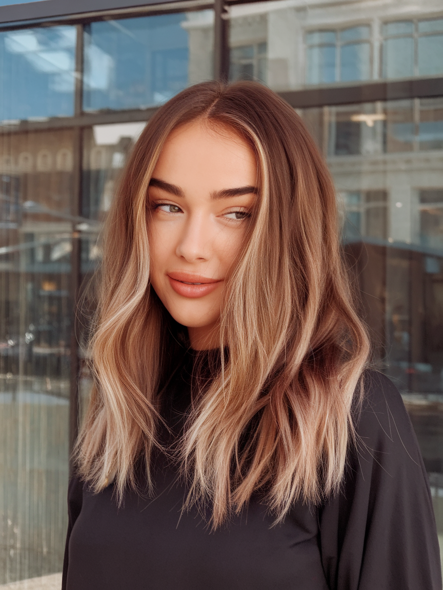 This medium-length layered haircut blends dark roots into honey-blonde ends, creating a seamless ombre effect. The long layers add flow and volume, while the soft curtain bangs frame the face. A trendy and low-maintenance choice for those who love natural color ideas in 2025.