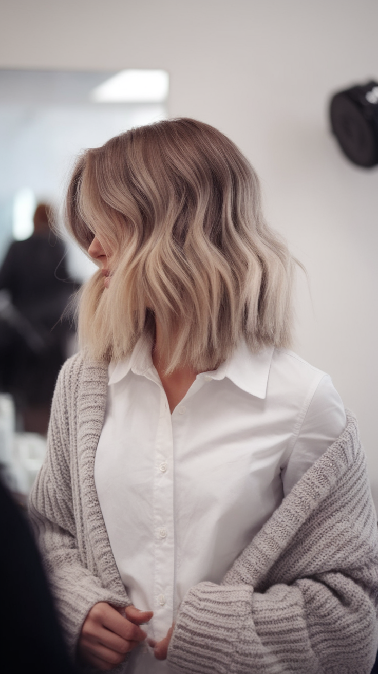 This medium-length layered haircut features ash blonde balayage for a soft and blended effect. The face-framing layers enhance the shape, while the choppy ends add texture. A trendy and elegant option for those looking for color ideas for 2025.