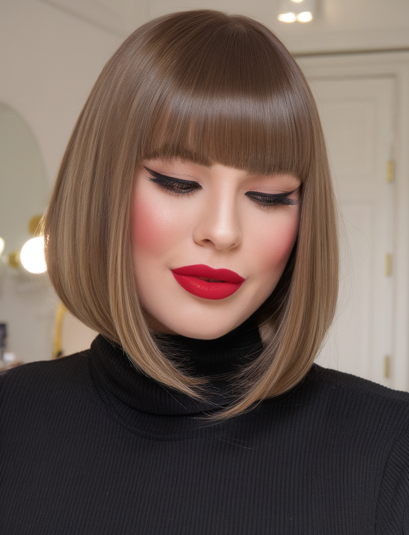 This straight, shoulder-length bob features a blunt cut for a sleek and polished look. The full bangs add a bold touch, complementing the smooth and structured shape. A trendy and sophisticated choice for those who love a classic and modern style in 2025.