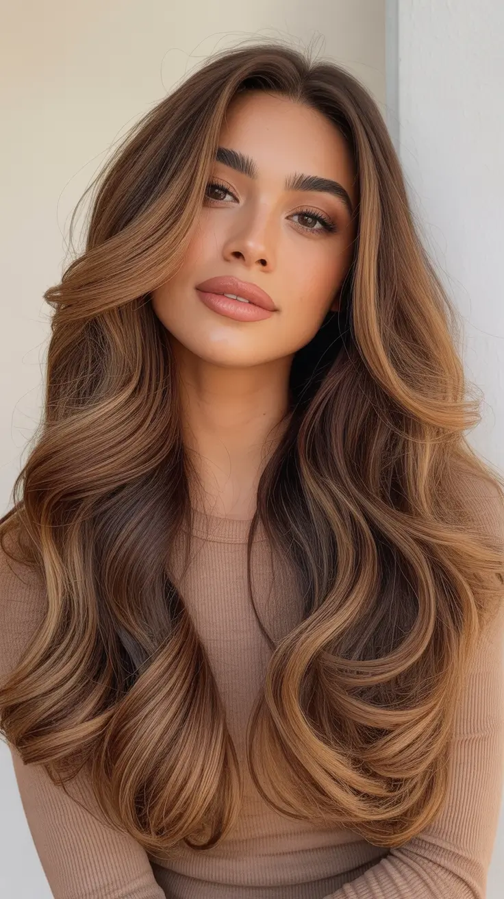 That balance of careless glam and natural goodness is what this hairstyle provides. The texture is emphasized with a rich brown base with soft caramel highlights that give the look a gorgeous, sun-kisses appearance. The warmth of tones does not merely match the silhouette of the hair, but it makes the entire style beautiful with the dimensional effect. The thick waves are falling down, with the natural spring, which makes the light fall into them in a manner that provides the hair with a natural, glowing look. The side swept type gives volume at the roots but a light and relaxed finish at the ends.