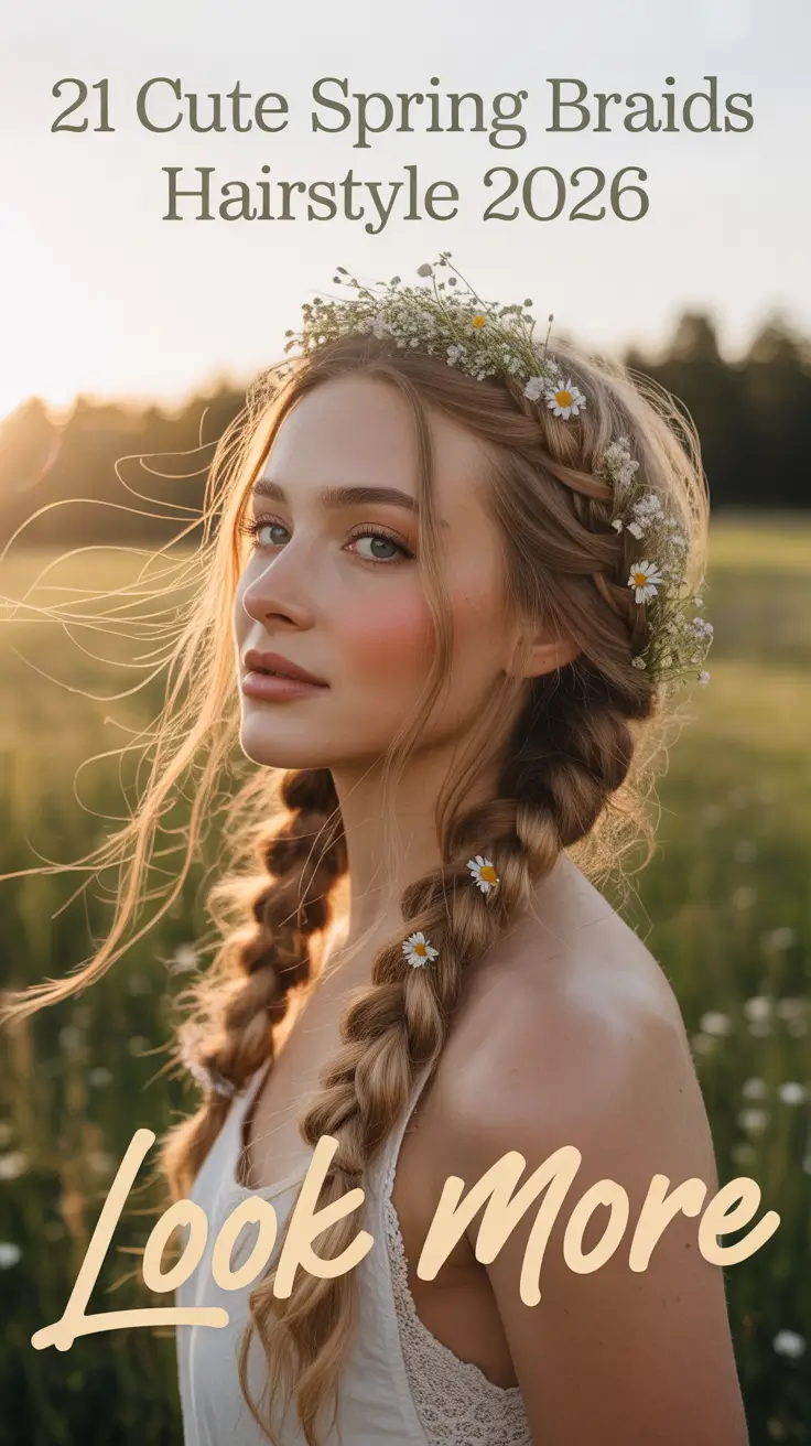 There’s something timeless about two balanced braids falling neatly over the shoulders, especially when they’re slightly loosened for softness. I love how this look feels Cute, carefree, and perfectly aligned with the spirit of spring braids hairstyle 2026. The subtle face-framing tendrils add movement, while the off-shoulder neutral top keeps everything light and romantic. It’s giving countryside energy, but make it modern.