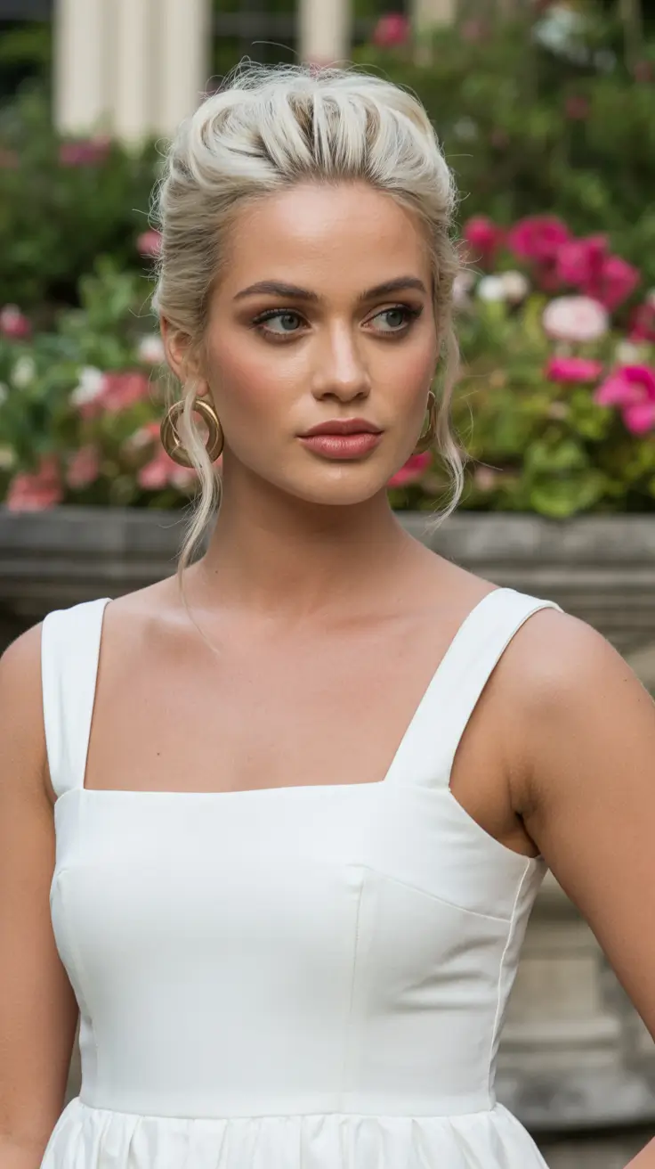There’s something about a softly structured Classic high bun in a bright, creamy blonde that feels like spring in human form. I love how this version is lifted but not tight, with volume at the crown and those intentionally Loose tendrils grazing the cheeks. It’s not a severe ballet bun – it’s more relaxed, almost whispering Messy, but still refined. The smooth finish through the top gives it that subtle Sleek energy, while the airy texture keeps it modern.