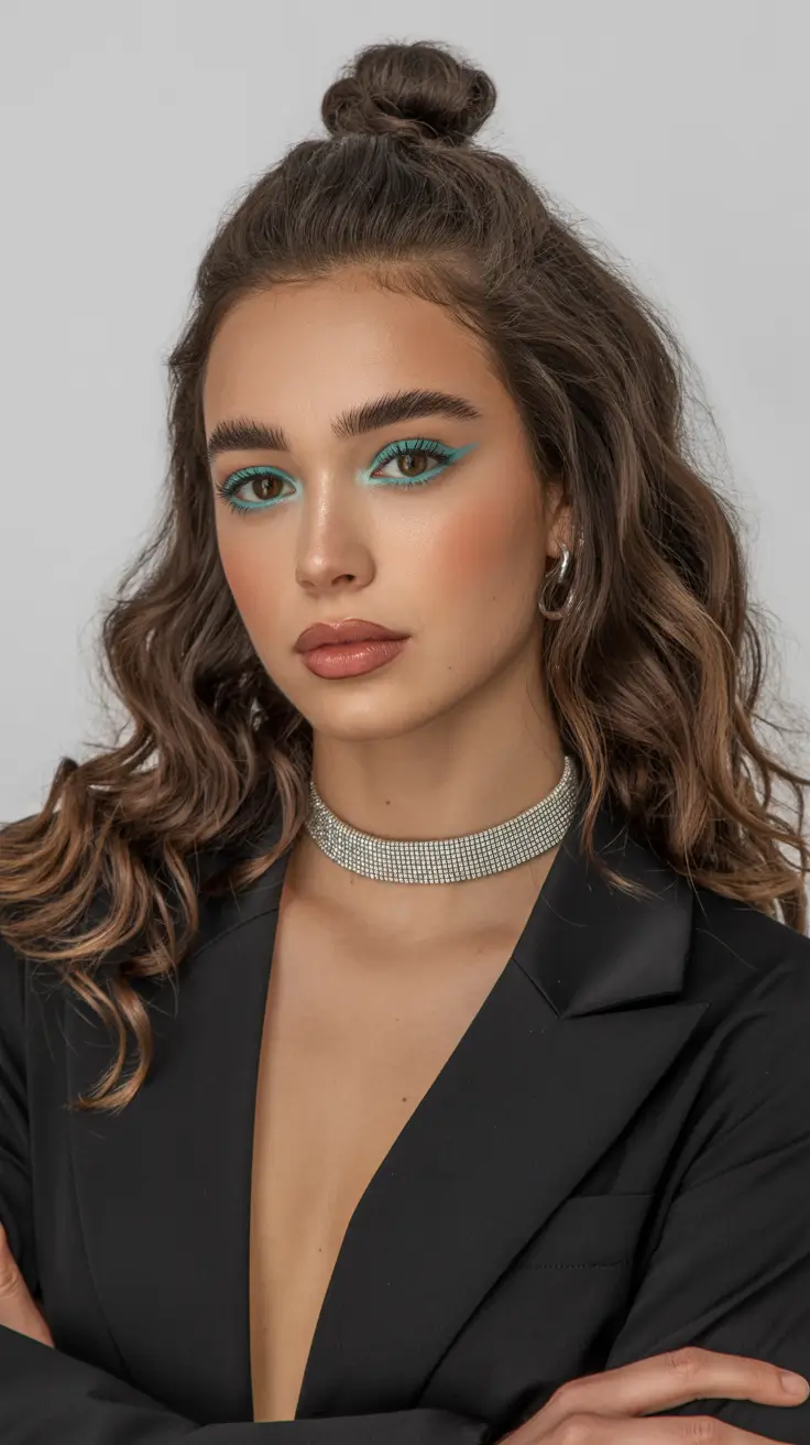 This version of the Half up bun feels relaxed but intentional. The top section is twisted into a small knot while the rest of the hair flows in soft, defined waves. I love how it balances polish and movement – not fully up, not fully down, just that sweet Half up half mood that works for daytime meetings or spring dinners. The texture through the lengths keeps it from looking flat, giving it that naturally Loose finish.