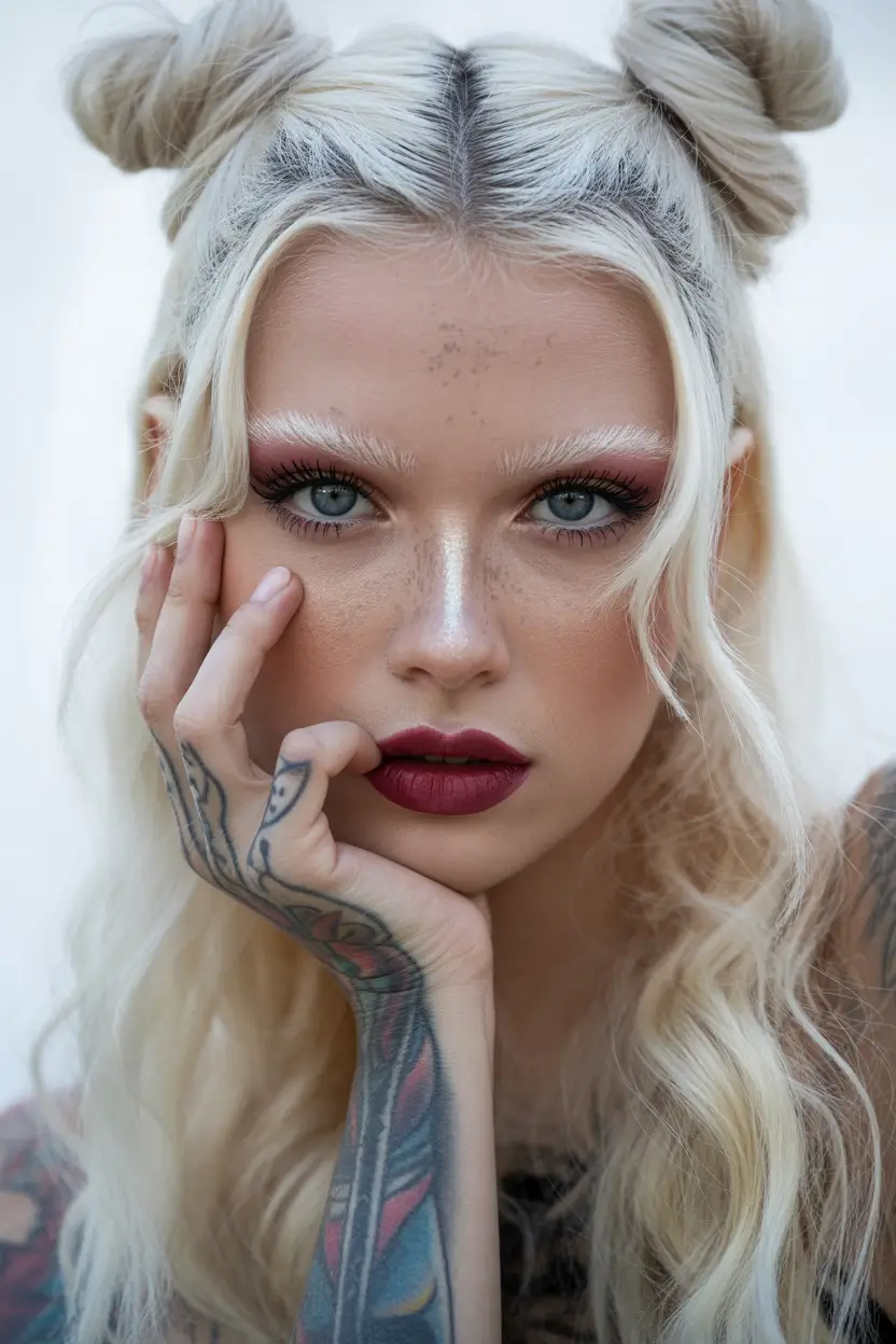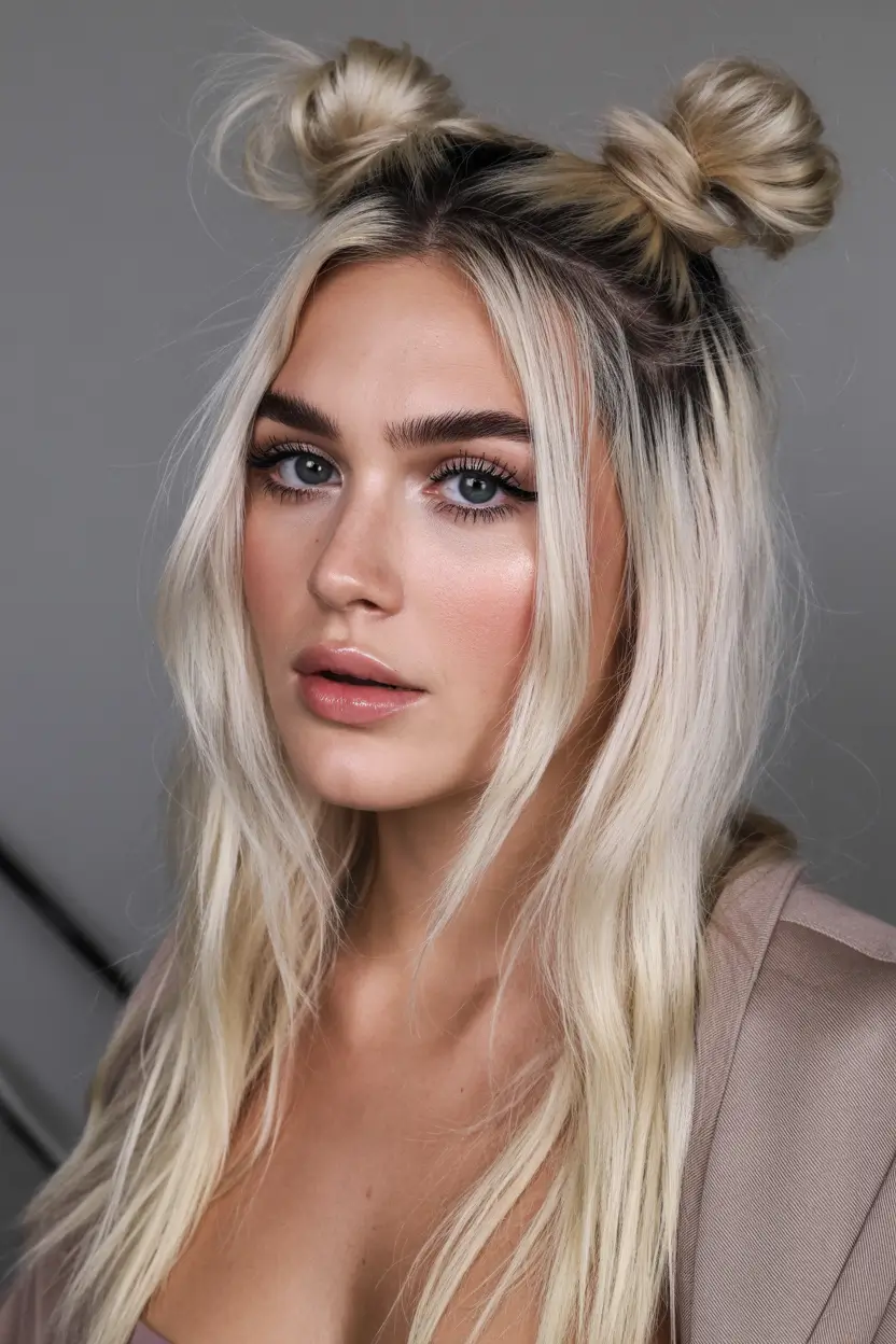 These Double buns sit high and playful, while the rest of the platinum lengths fall straight and glossy. The contrast between the structured knots and the relaxed hair underneath gives this look a modern Space vibe without going full festival. It feels youthful, fresh, and very aligned with the bold side of spring buns hairstyle 2026.