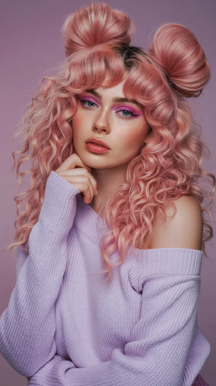 And then we go full statement. These voluminous Curly buns in a rosy pastel shade are bold, feminine, and impossible to ignore. The texture through the lengths adds drama, while the rounded buns on top keep the look cohesive. It is giving modern Space buns but with runway-level confidence.
