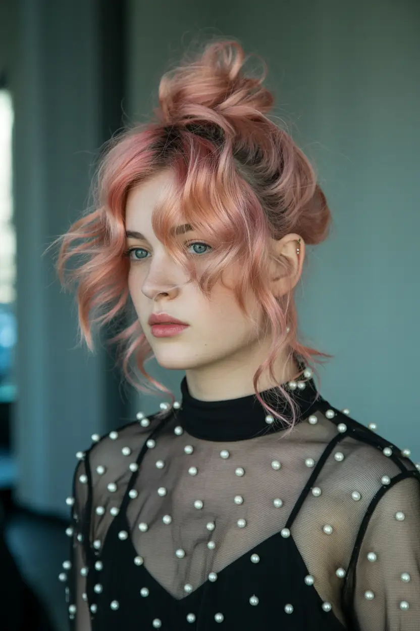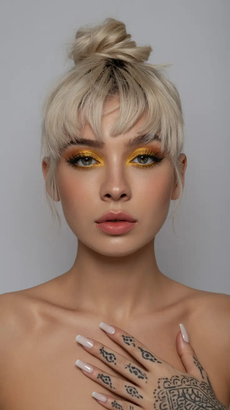 There’s something deliciously bold about pairing a Sleek top knot with soft, wispy bangs. I love how this bun sits high and tight, almost architectural, while the fringe falls forward in a deliberately Loose way. The platinum blonde tone keeps it modern – icy but not harsh – and the little flyaways around the hairline stop it from feeling too severe. It’s a Classic high bun, but updated for 2026 with that contrast between controlled crown and airy front.