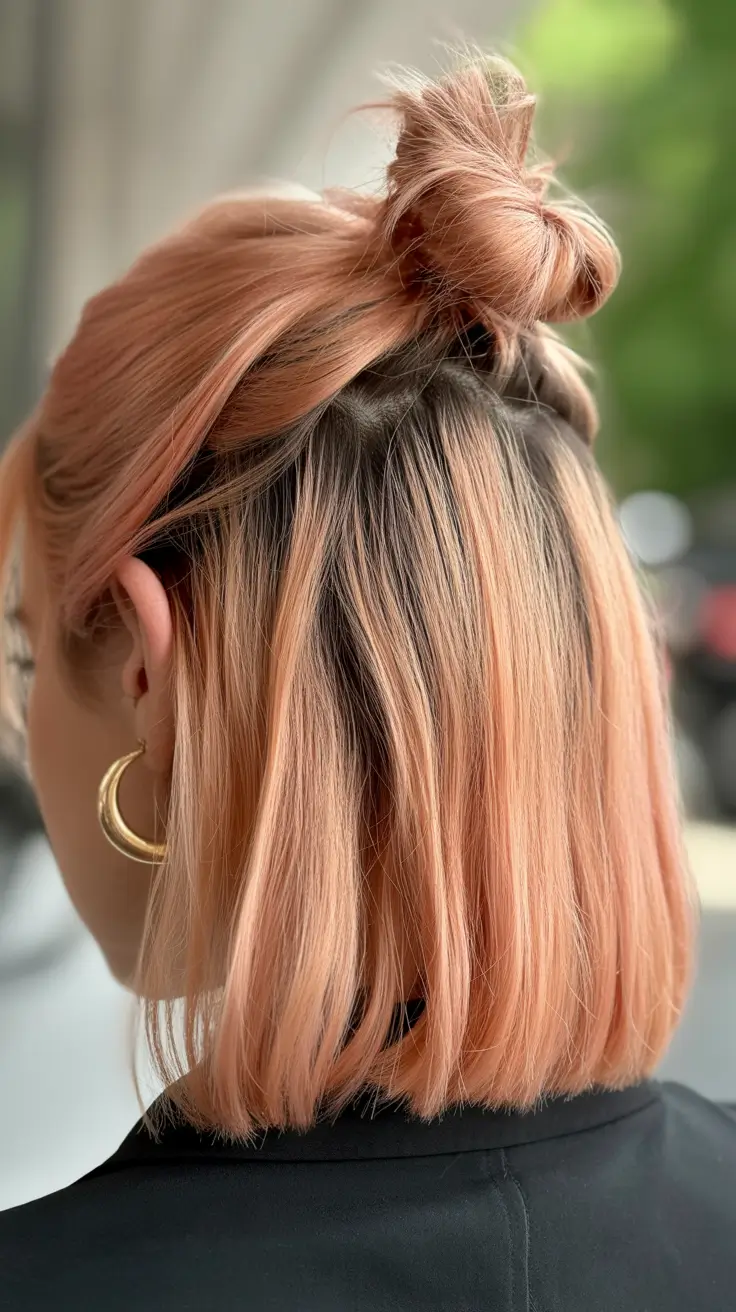 This one feels like spring bottled into a hairstyle. A soft peach tone, cut into a blunt bob, pulled into a Half up bun that leaves the rest straight and swinging. I love how the darker roots peek through – it gives depth and makes the color feel intentional, not flat. The bun itself is compact, slightly Messy, not overly polished.