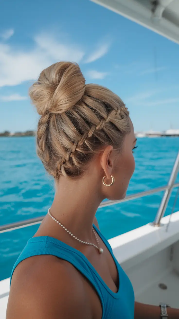 This one makes me want to book a trip immediately. A smooth, rounded bun at the crown, wrapped with a neat Braided detail that travels along the head like a halo. It’s polished but still breathable. Not stiff. Not overdone. Just clean lines and thoughtful placement.