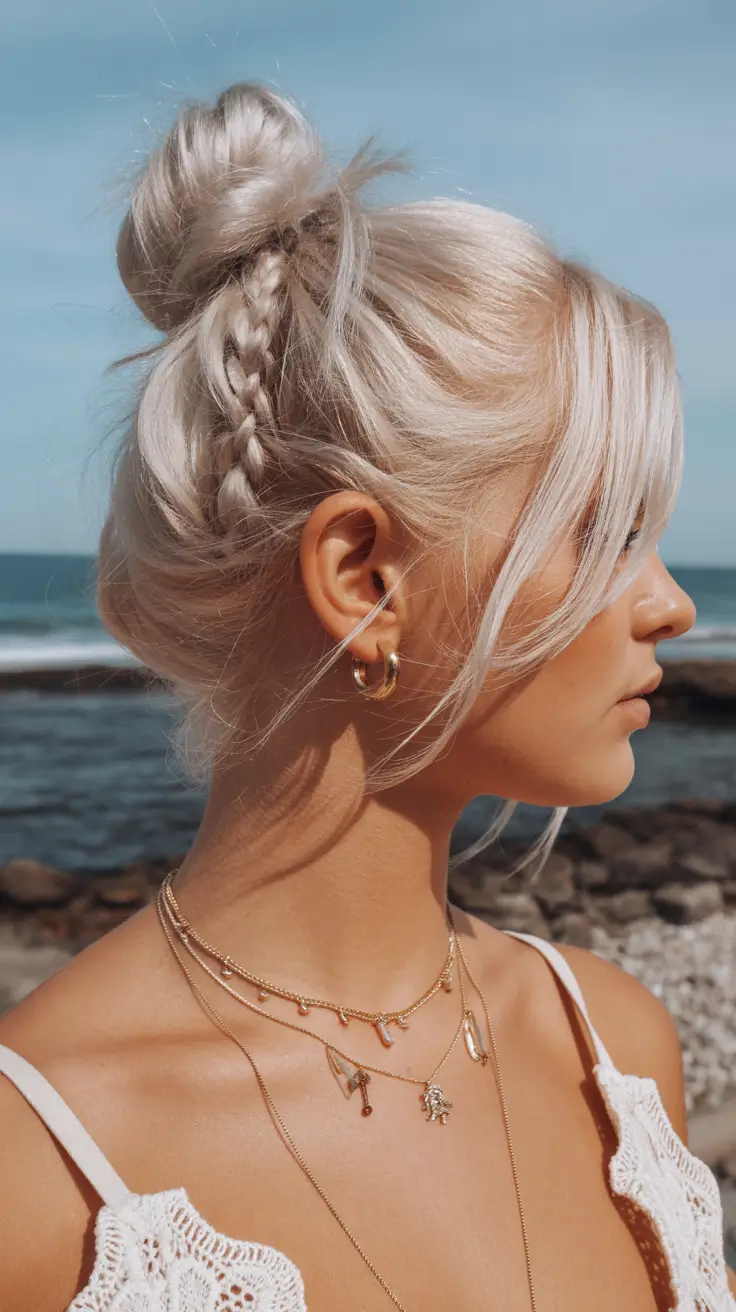 There’s something quietly magnetic about this Low bun – smooth at the crown, gently gathered at the nape, with a delicate Braided detail woven along the side like a secret. I love how the blonde shade catches the light, almost pearly, and how a few Loose face-framing strands soften the profile. It feels both Classic and current, structured yet romantic, the kind of spring buns hairstyle 2026 that works from beach mornings to candlelit dinners.