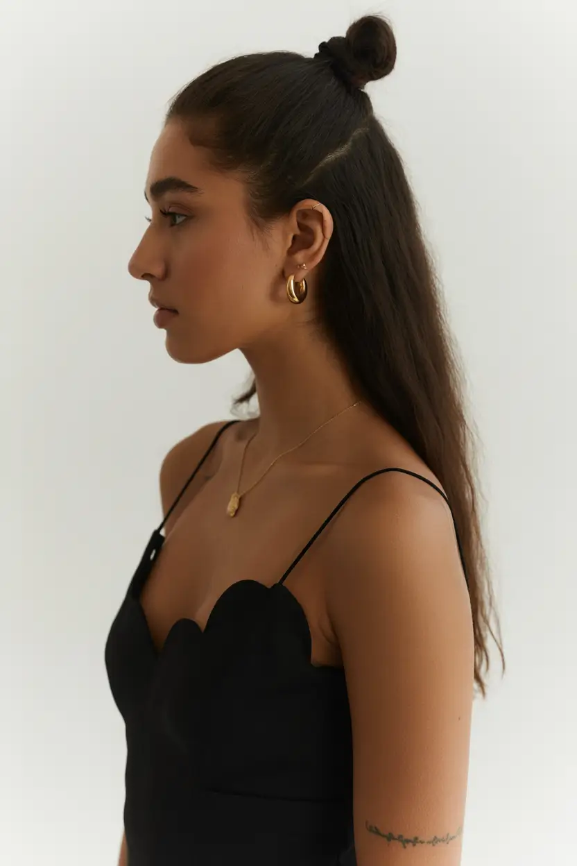 To keep this style sleek through the lengths, I smooth a lightweight serum like Gisou Honey Infused Hair Oil only on the ends. The top knot should feel effortless, not bulky. It is the kind of Easy style I reach for when I want that subtle Half up half energy without overthinking it.