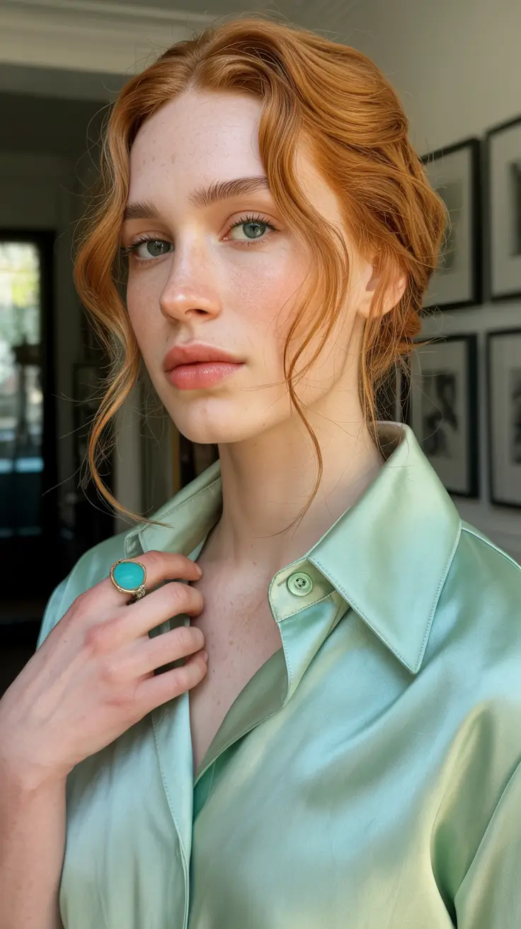 This copper-toned beauty leans into a Low bun with natural movement and delicate face-framing pieces. The texture is slightly Curly, almost airy, which makes the whole look feel fresh and spring-ready. It is romantic but not overworked – that sweet spot between Messy low and intentional elegance.