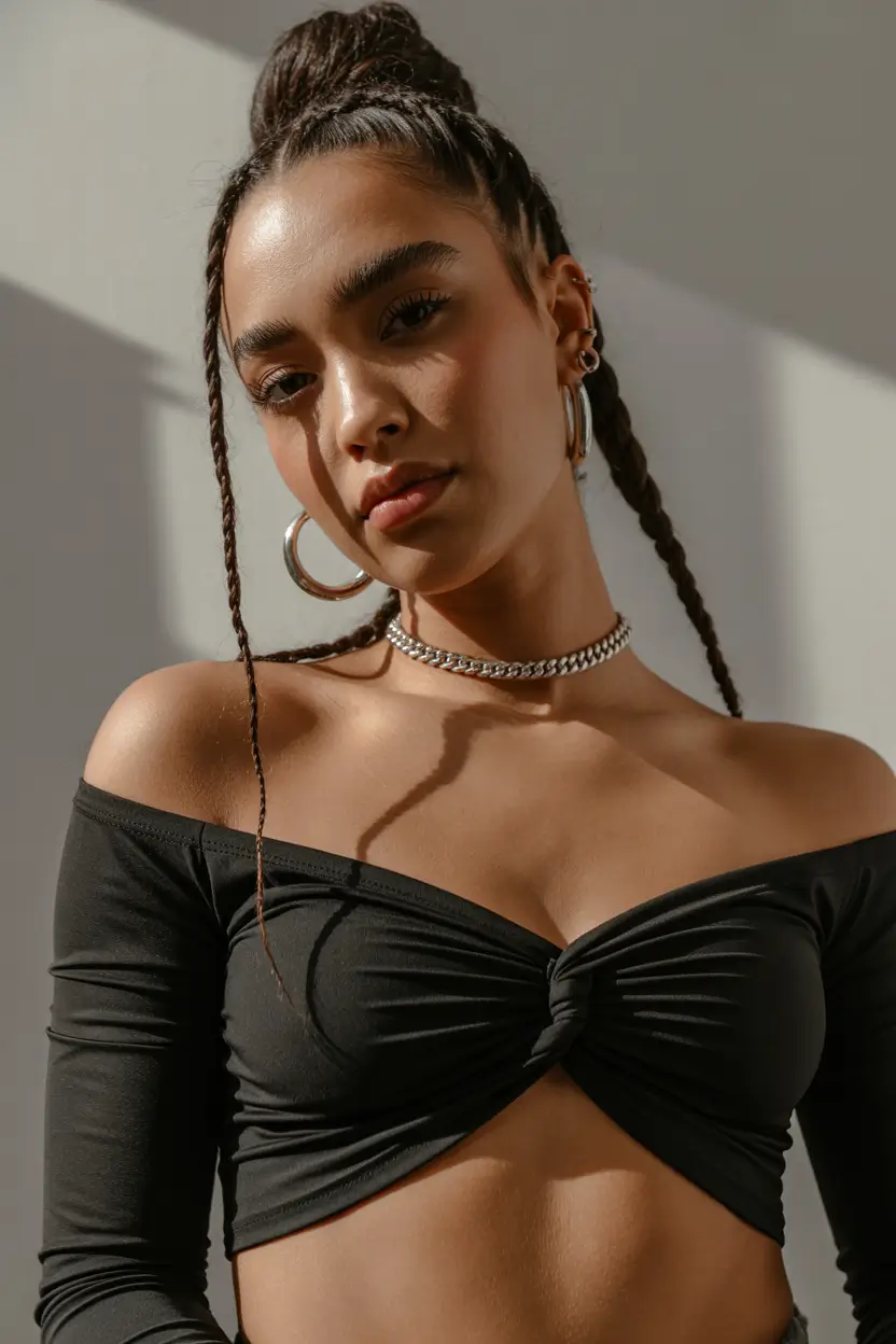 Now we are talking texture. This high bun incorporates visible Braided sections that wrap and feed into the knot, giving it depth and edge. A couple of thin braids frame the face, adding that cool-girl contrast. It feels bold, slightly Fancy, and completely aligned with the experimental side of spring buns hairstyle 2026.