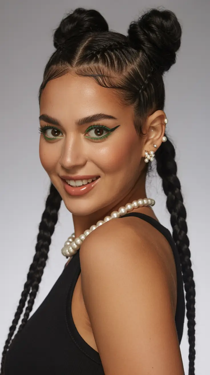These Double buns bring back that nostalgic Space vibe but with a cleaner, more sculpted finish. The hair is parted down the center and formed into two symmetrical knots, while long braids fall from each side for extra drama. It is playful, a little rebellious, and surprisingly wearable for spring nights out.