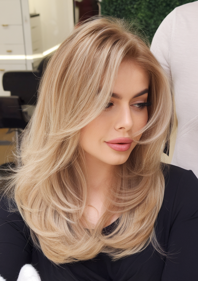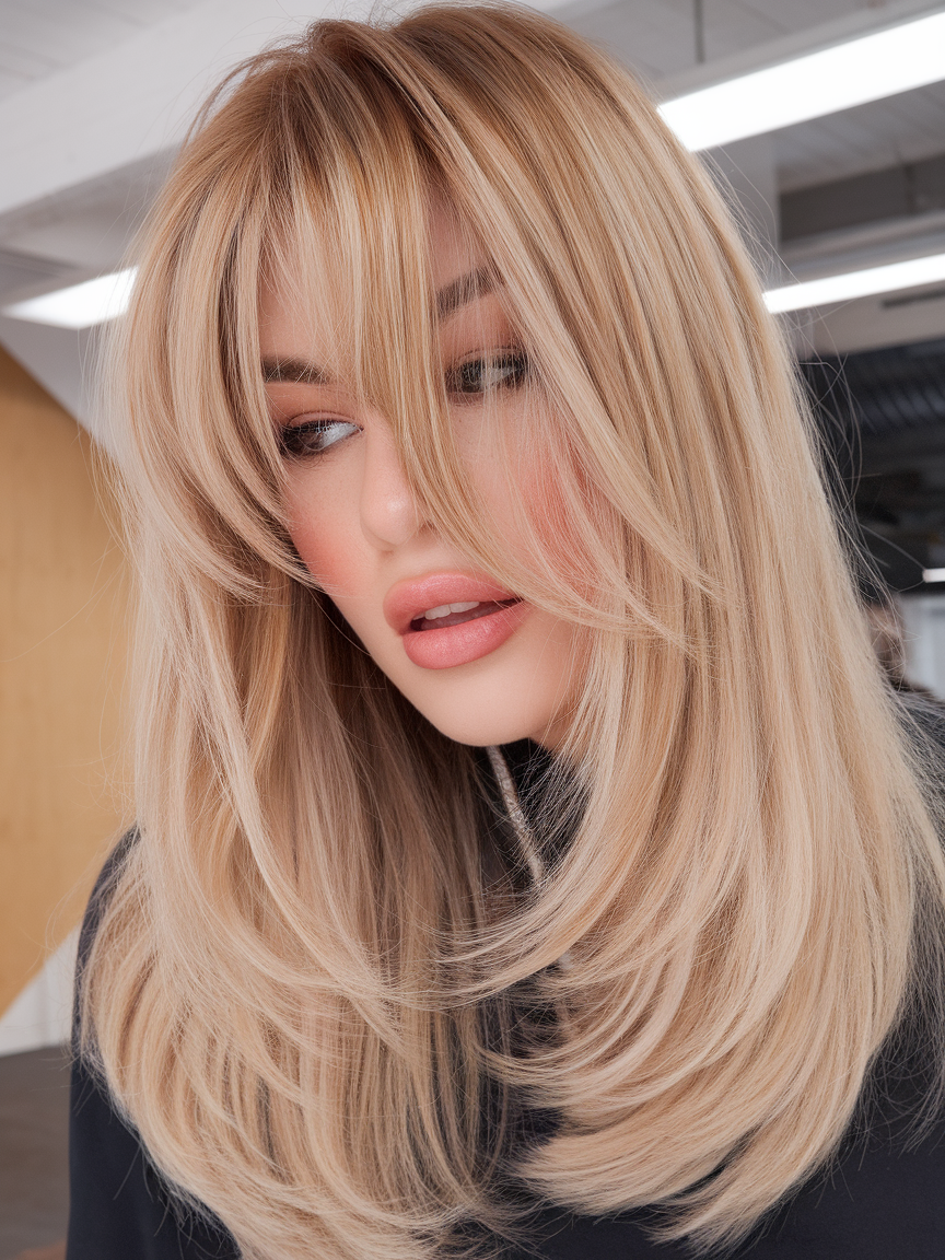 This medium layered hairstyle is perfect for women who want a relaxed yet polished look. The soft blonde layers frame the face beautifully, while the curtain bangs add a youthful vibe. Ideal for spring outings or casual school days.