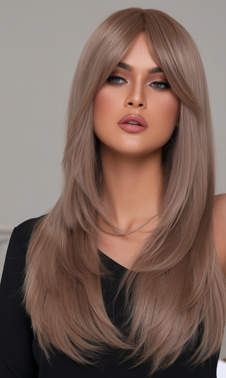 This medium-length hairstyle features sleek taupe layers that fall effortlessly around the shoulders. The curtain bangs frame the face beautifully, making this style ideal for round faces. Perfect for spring, the subtle taupe shade enhances a polished look.